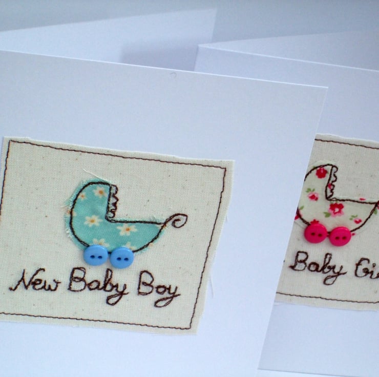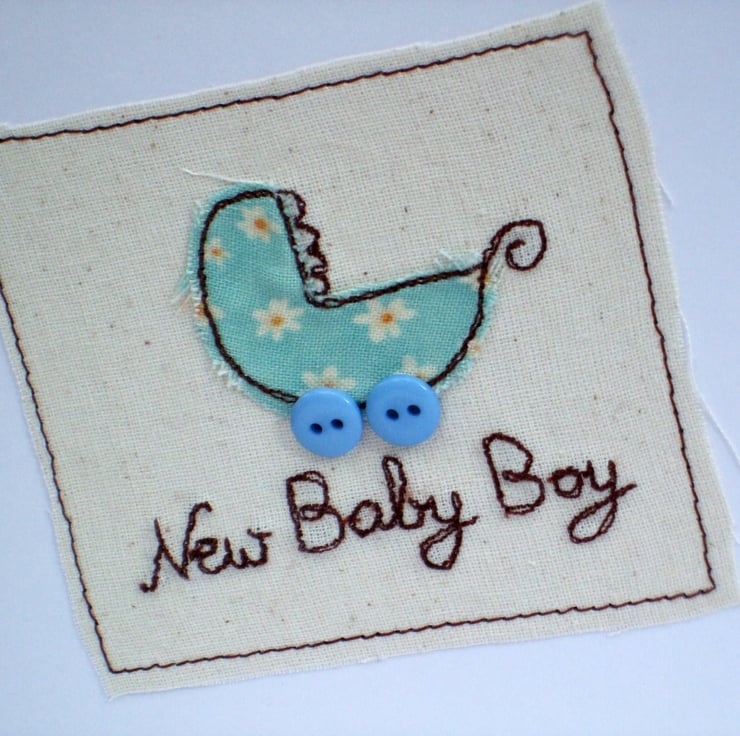 This new baby boy card with a cute baby's pram and button wheels has been freestyle machine embroidered and makes a lovely and unique card to welcome a new baby boy into his family.