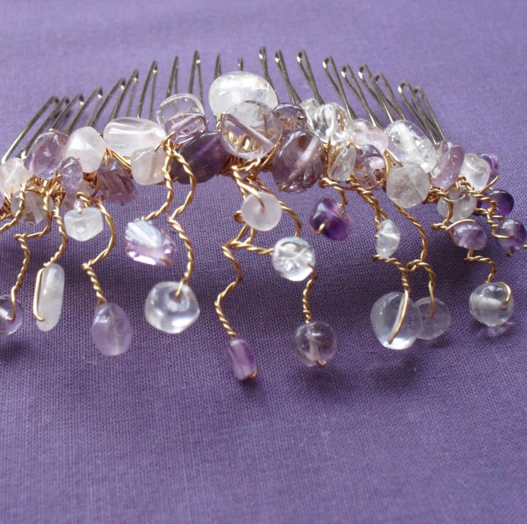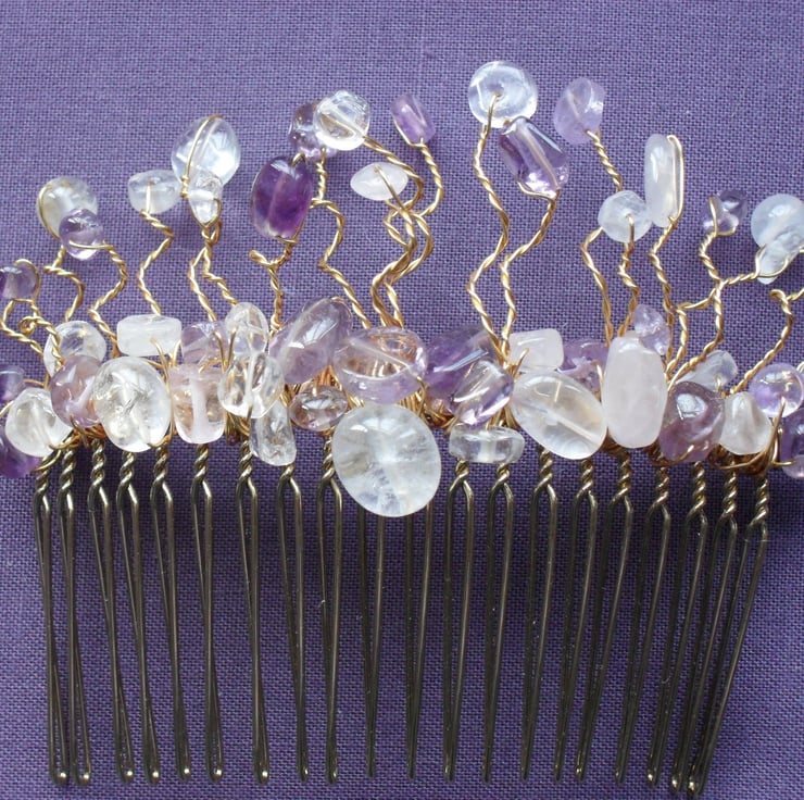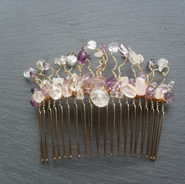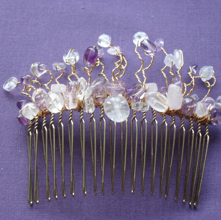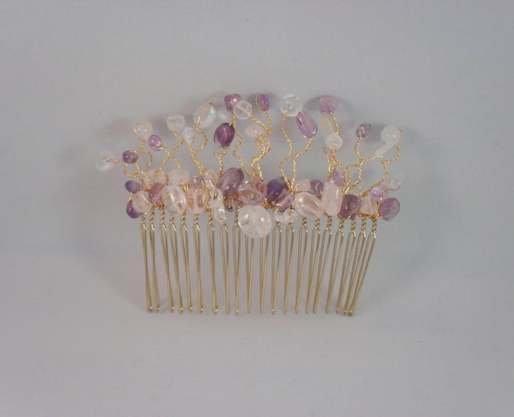 SALE was £20 now £10 Amethyst,quartz and rose quartz beads are attached to a gold tone metal comb with gold coloured wire.