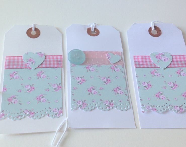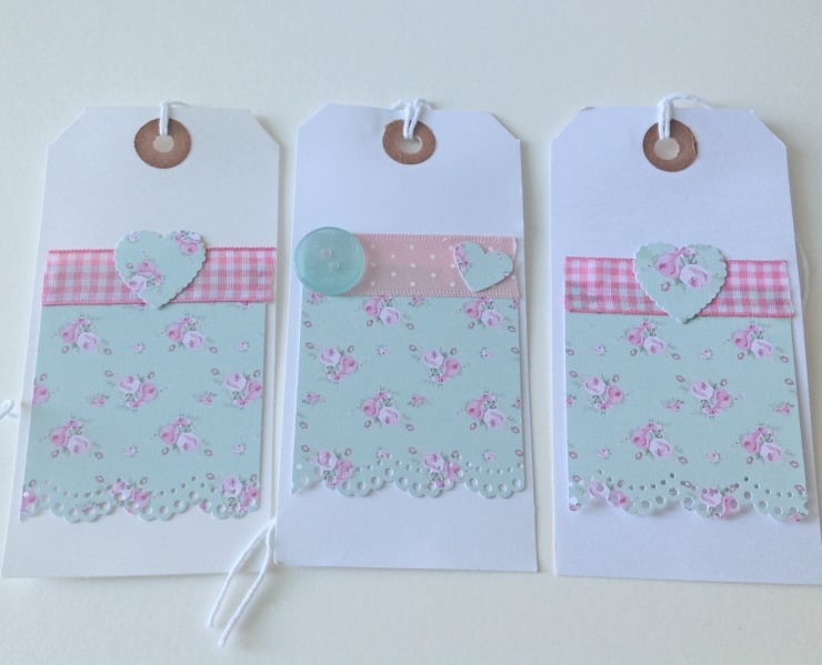The design is made up using a shabby chic style printed card mounted onto a plain white tag.