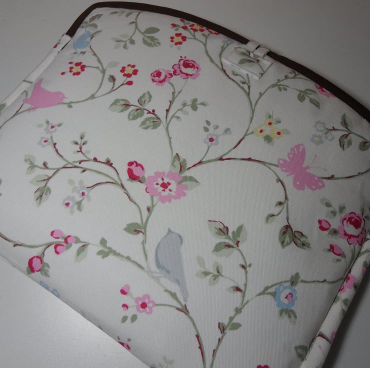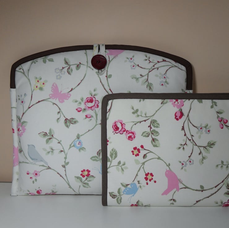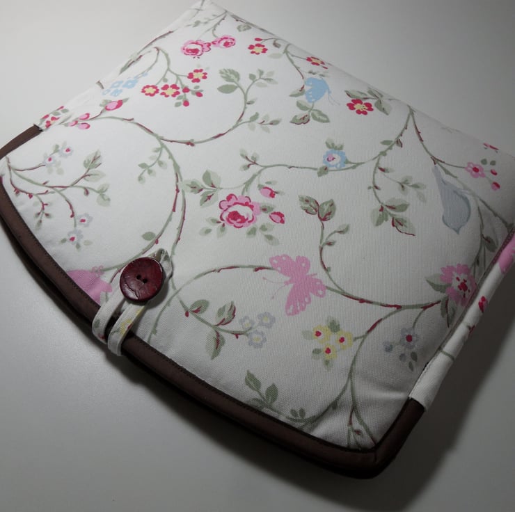 This sleeve is made for holding a 12.5" laptop. It is made from 100% cotton fabric called "Bird Trail" by Clarke & Clarke. The sleeve is well padded with thick wadding to protect your laptop. The measurement is 13.5" wide by 11" high.