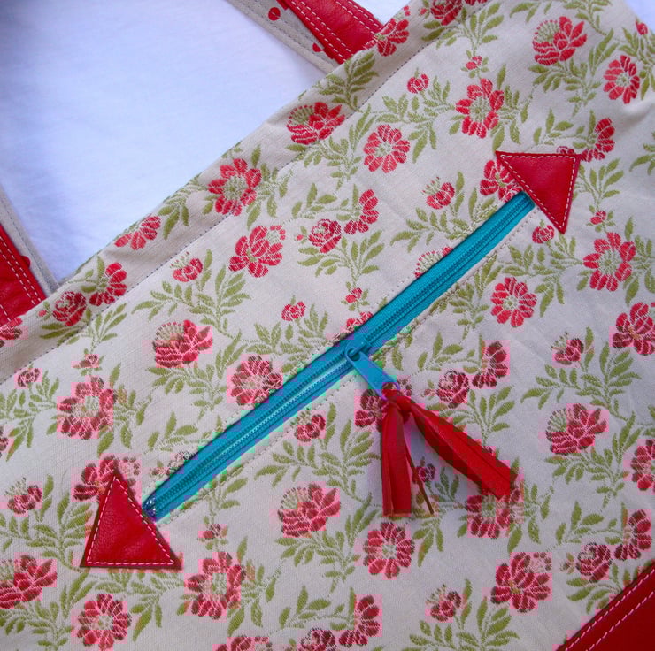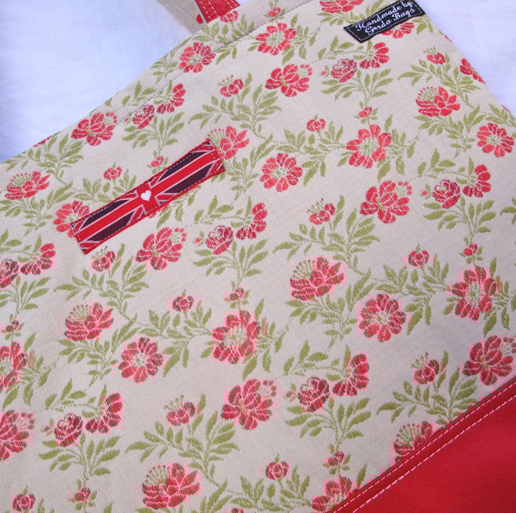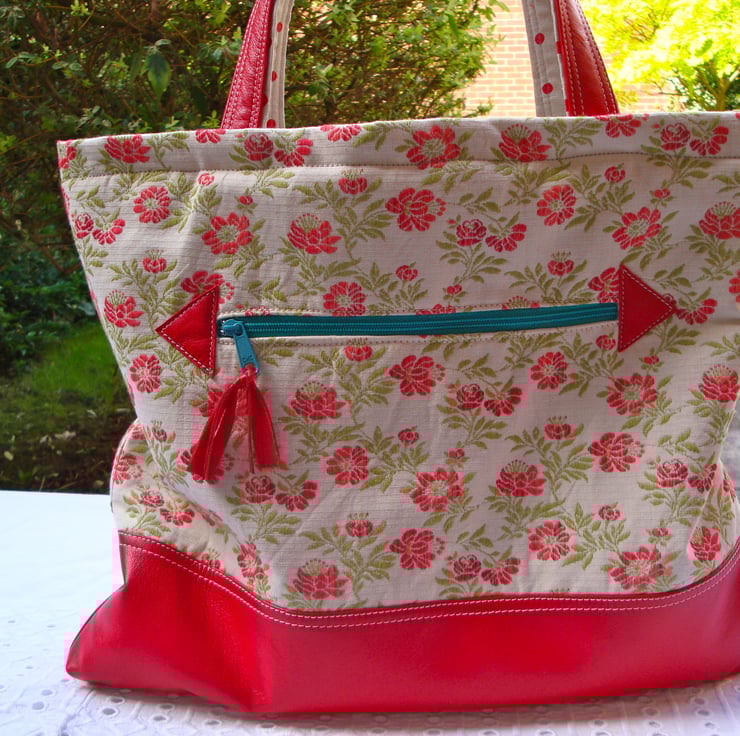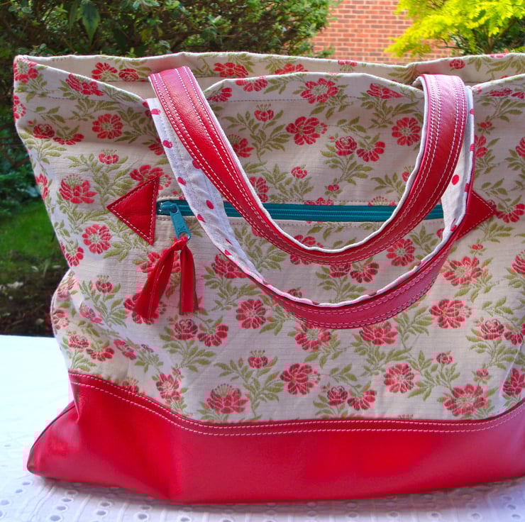 I made this lovely tote / handbag to my own design in 2 fabrics . A floral cotton tapestry fabric - and a red soft genuine lambskin leather.