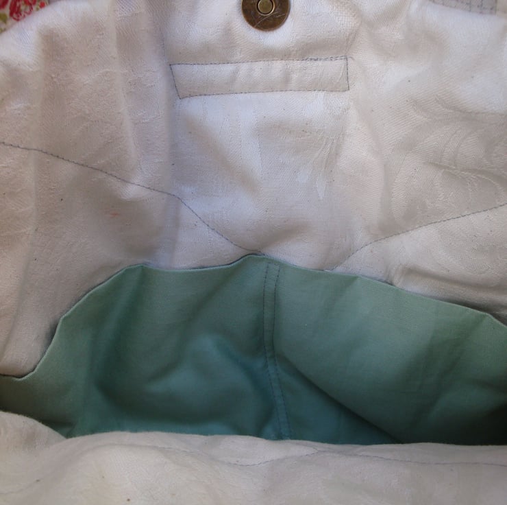 Bag is fully lined in a cream decor cotton fabric, with 2 internal slip pockets.