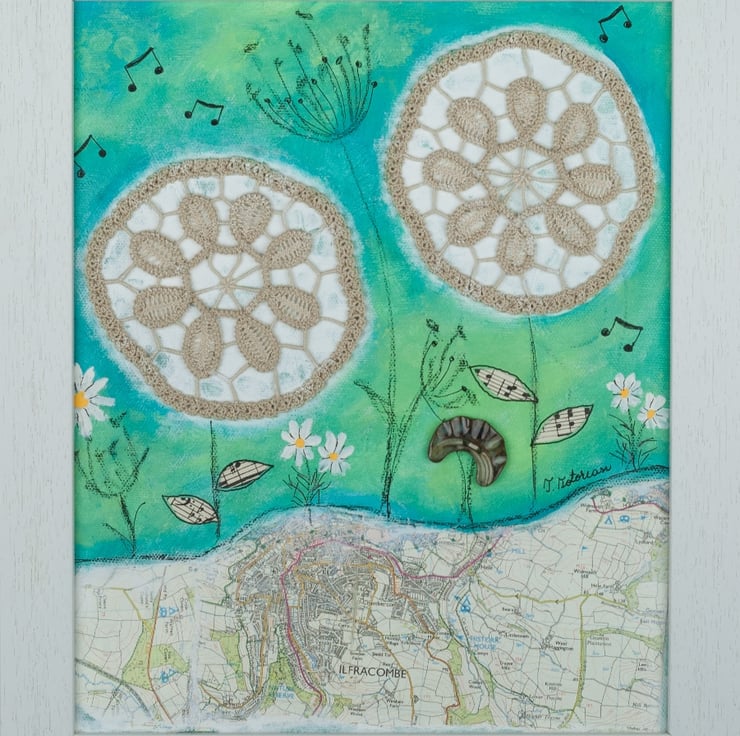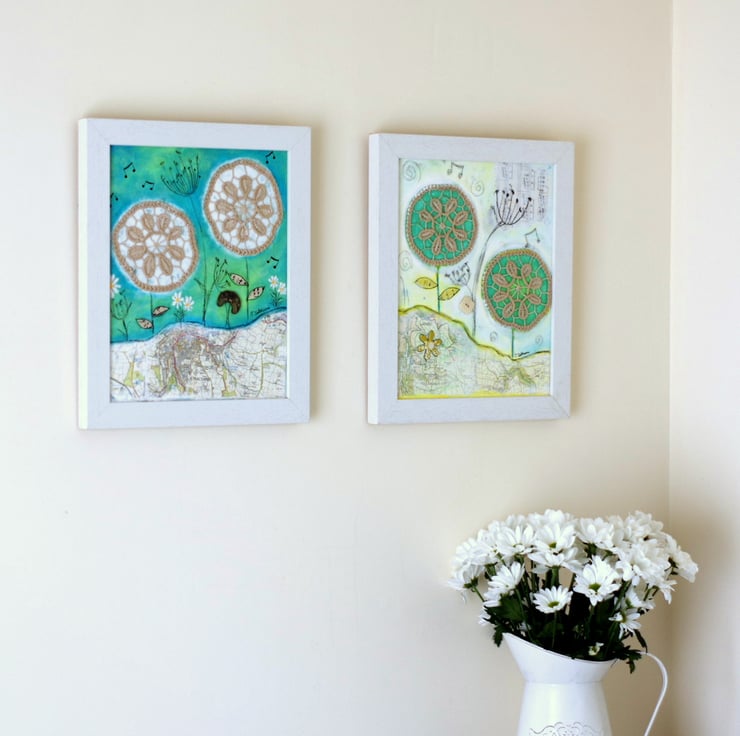 I created a collection of mixed media paintings in which I used doilies and lase pieces made by my mother. I always wanted to collaborate with my mother to create something unique and this is how this collection was born. have a look in my shop for similar items.