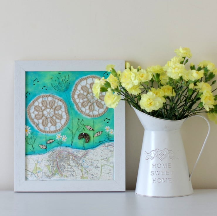 Mixed media painting inspired by nature, titled "Evening Meadow II". Materials used: handmade doily, funky button, map paper, music paper, acrylic, charcoal, gesso. Framed and ready to hang. Size: 12" X 14".