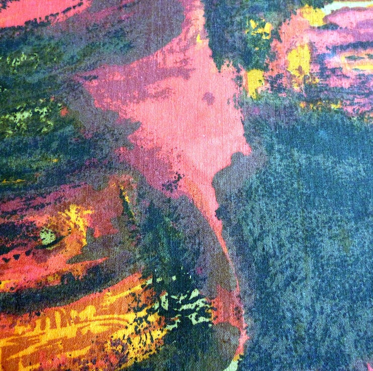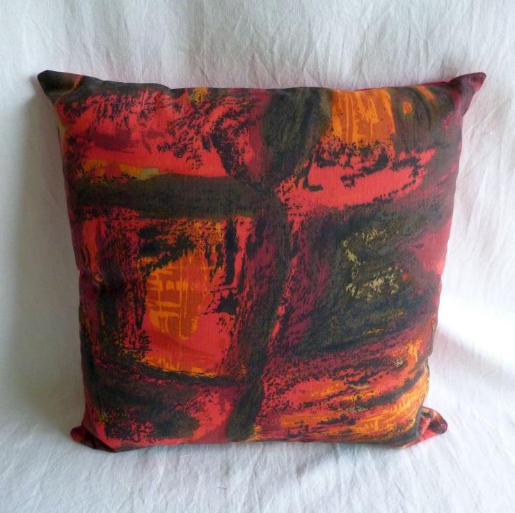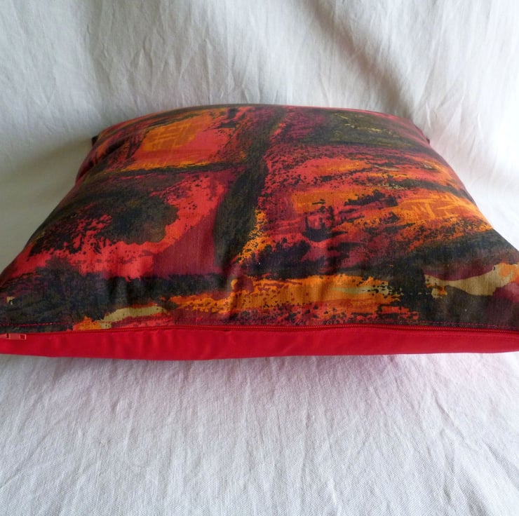 This cushion cover is made from a piece of unused vintage Francis Price cotton fabric which features a vibrant random design called Aurora in shades of red, orange and black and dates from the 1960s. The back of the cushion cover is made from plain red cotton twill and the cover fastens with a zip at the bottom. The cover is made to a high standard and all internal seams are overlocked for strength.