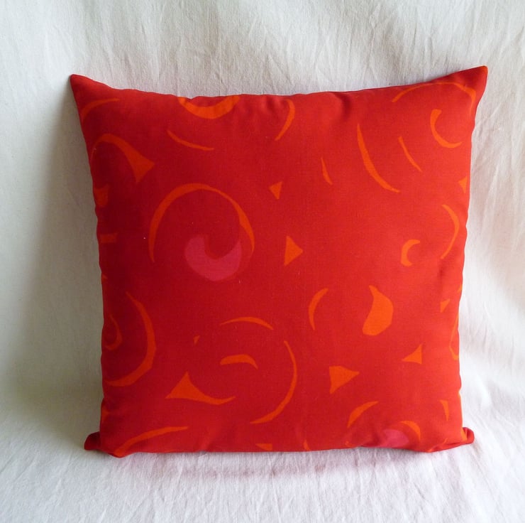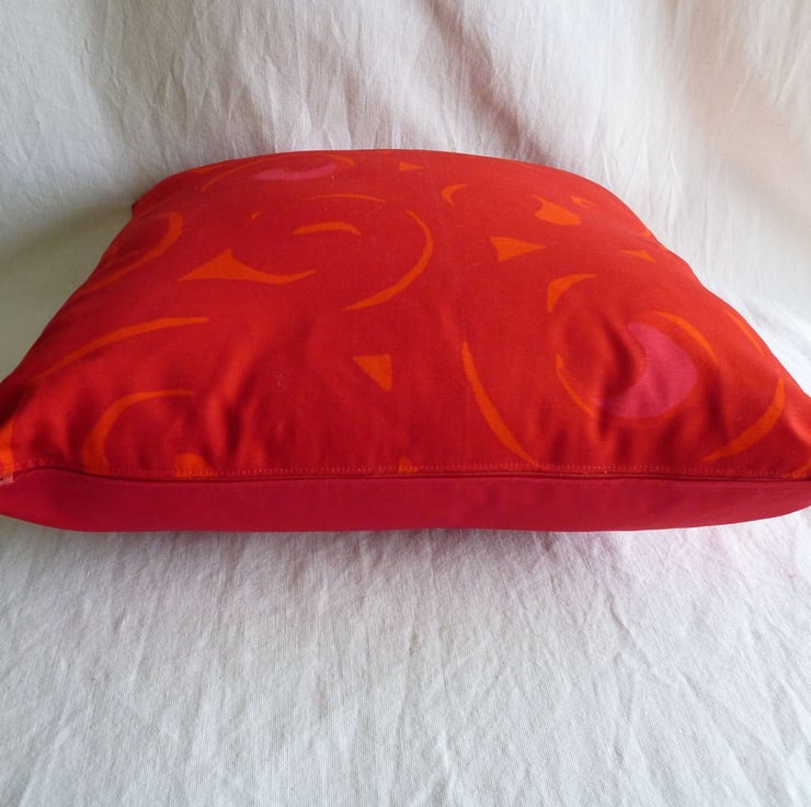 This cushion cover is made from a piece of unused vintage fabric designed by Karina Kellomaki for Sonaatti Marimekko and produced by Suomi Finland in 1967. The vibrant design features swirls in shades of red, orange and pink. The back of the cushion cover is made from plain red cotton twill and the cover fastens with a zip at the bottom. The cover is made to a high standard and all internal seams are overlocked for strength.