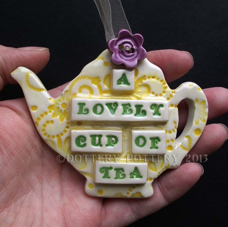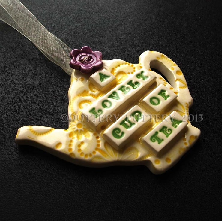 This little hanging teapot decoration is made from white earthenware clay and has the words A lovely cup of tea on it.