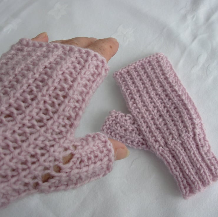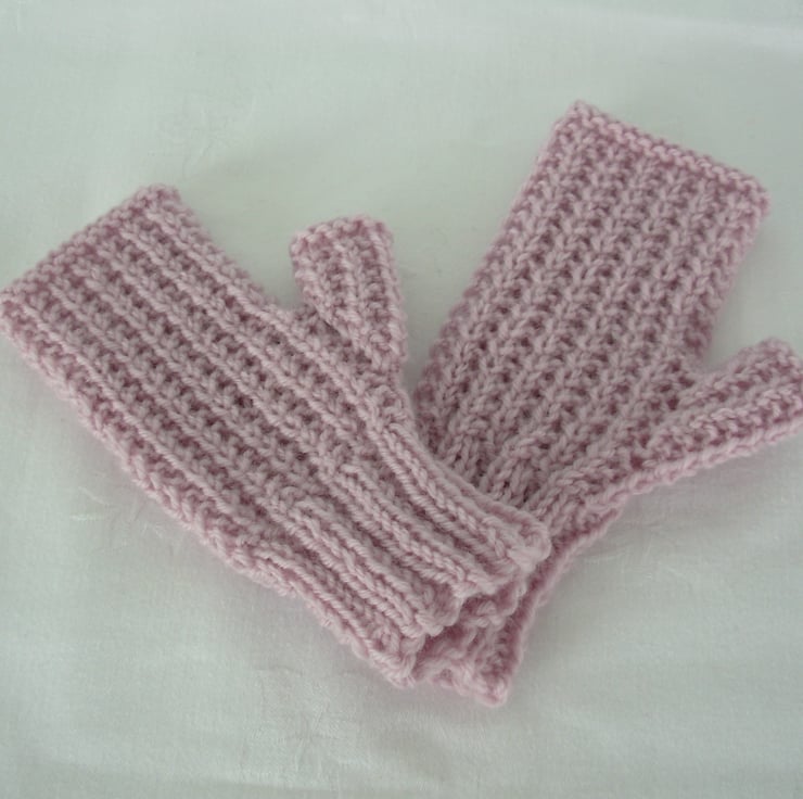 These adults fingerless mitts are knitted in a rice pattern in pale pink wool yarn.