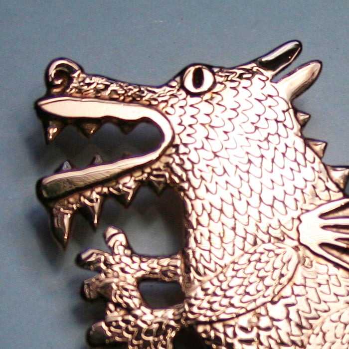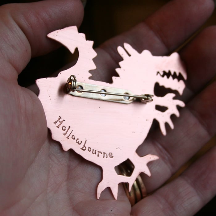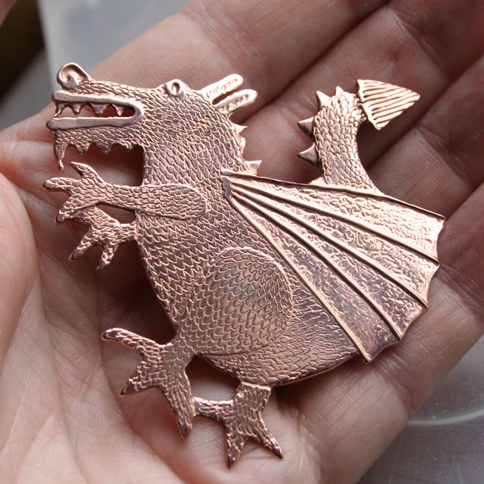 Large copper dragon brooch, with less spiky claws than his golden counterpart.