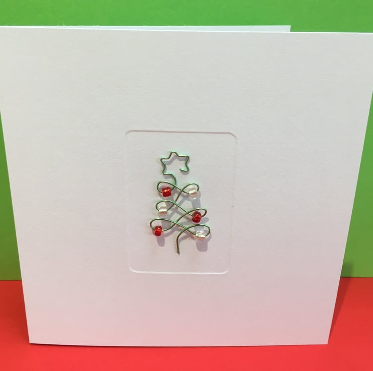 This simply stunning Christmas card consists of a delicately twisted green wire tree with a star on top and threaded red and silver baubles in the form of beads attached to a quality white card.