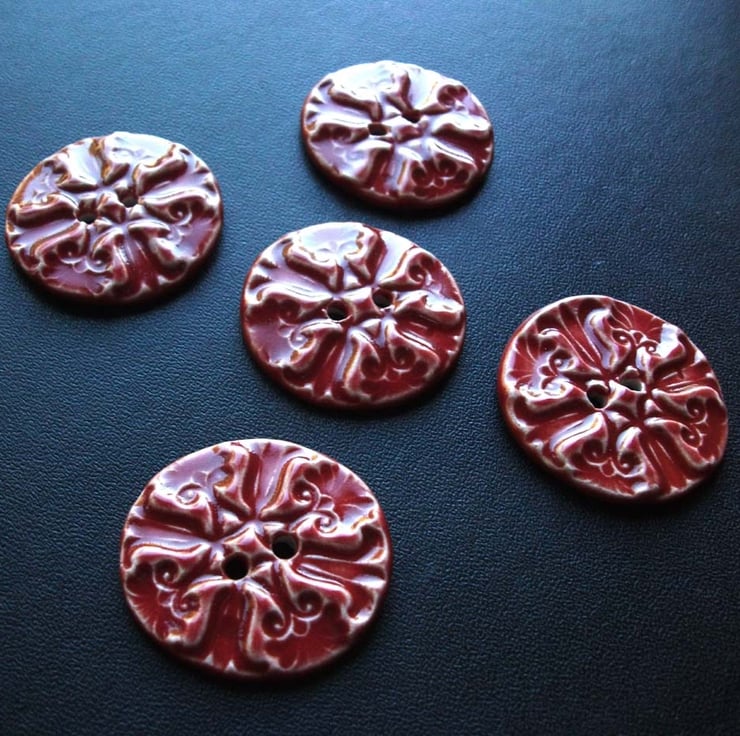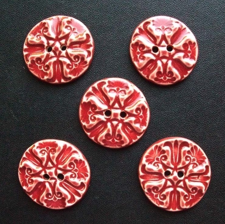 This set of five buttons are made from white earthenware clay, embossed and glazed to 1100 degrees, so nice and strong.
