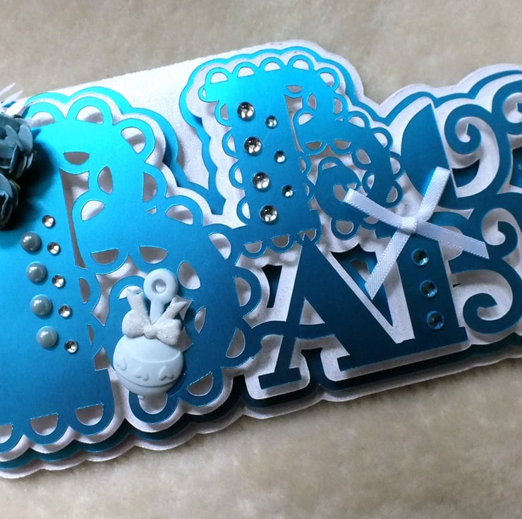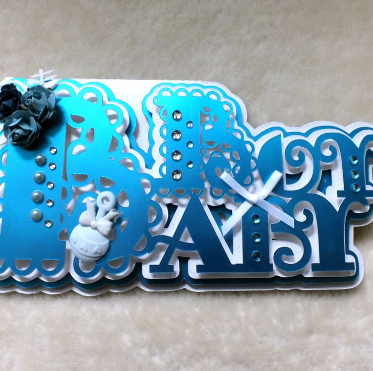Celebrate with this cute handmade 'Baby Boy' word card. The card base is made from premium quality centura card stock which has a pearlised finish, layered with blue mirror card. Embellishments include a bow, rattle, plus faux gems and pearls. The card includes the sentiment 'Congratulations' inside, and is approx. DL in size.