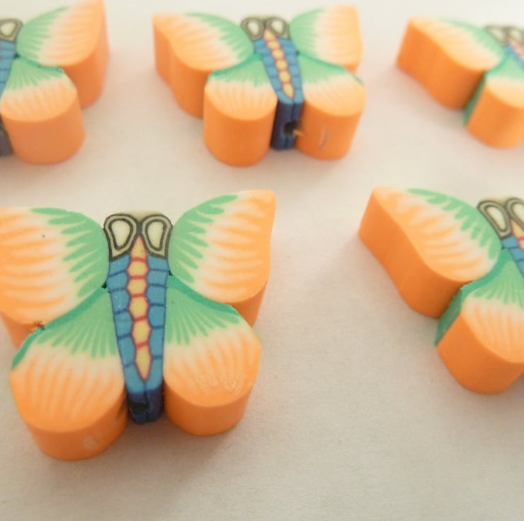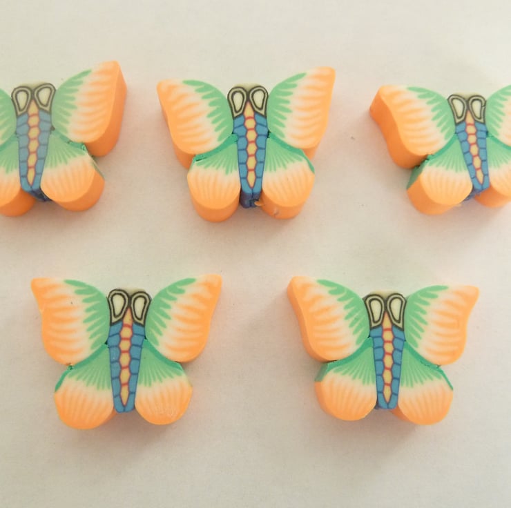 A pack of 5 large polymer clay butterflies, they are orange and green in colour.