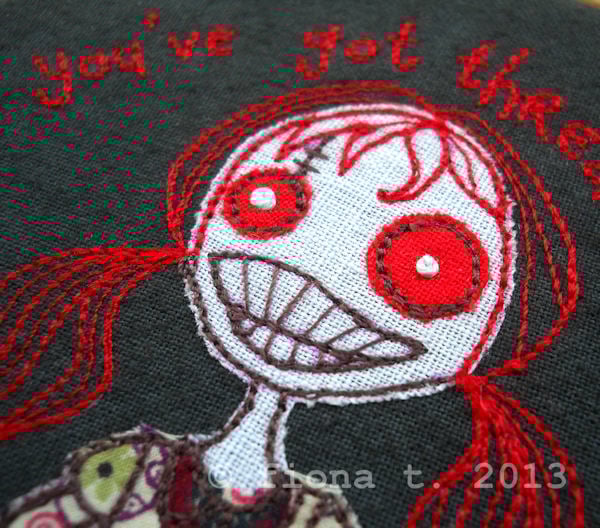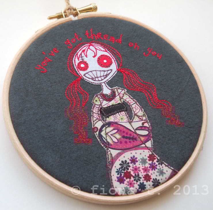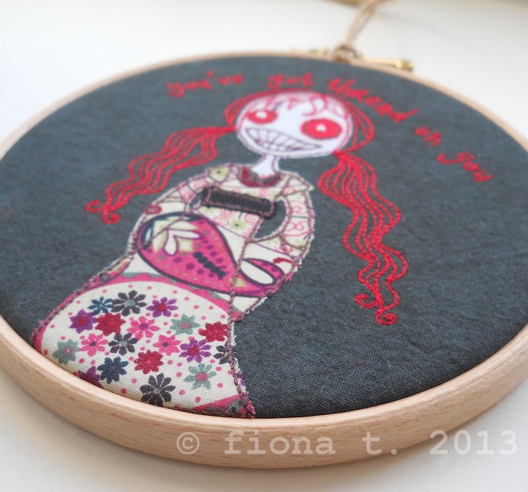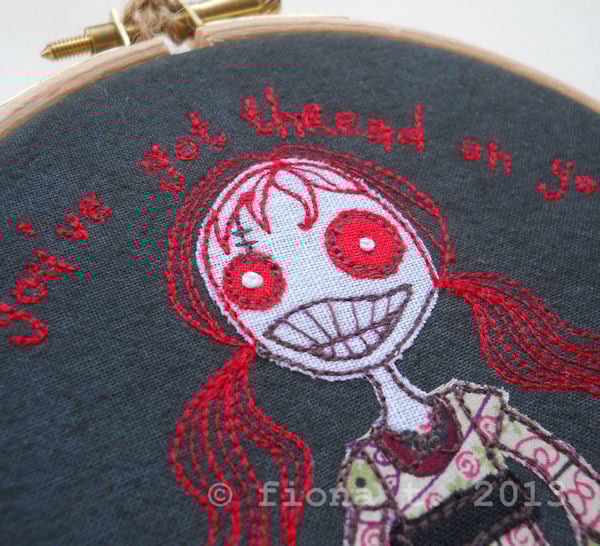 this little hoop measures 14cm (5”) in diameter, with a quote from 'shaun of the dead' (well, kinda) freehand machine embroidered across the top.