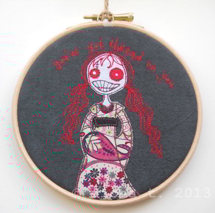 the fabrics are layered and appliqued onto cotton calico which i've hand dyed black, and the intricate details drawn on with free machine (free motion) embroidery.