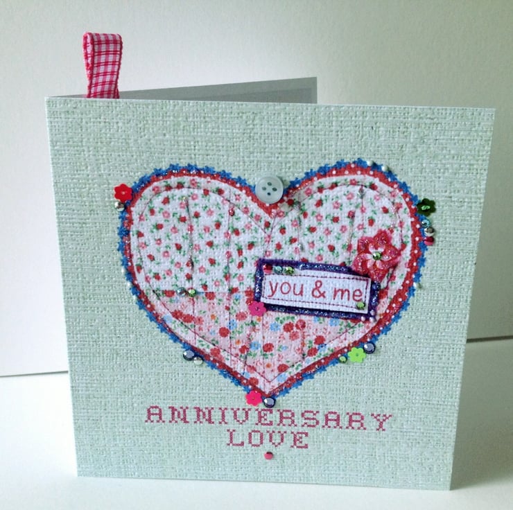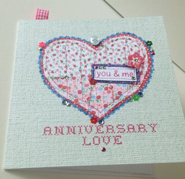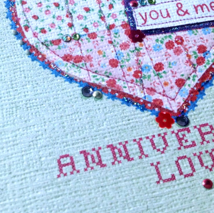 I have then carried the cross stitch them to the greeting on the front of the card which is 'Anniversary Wishes'