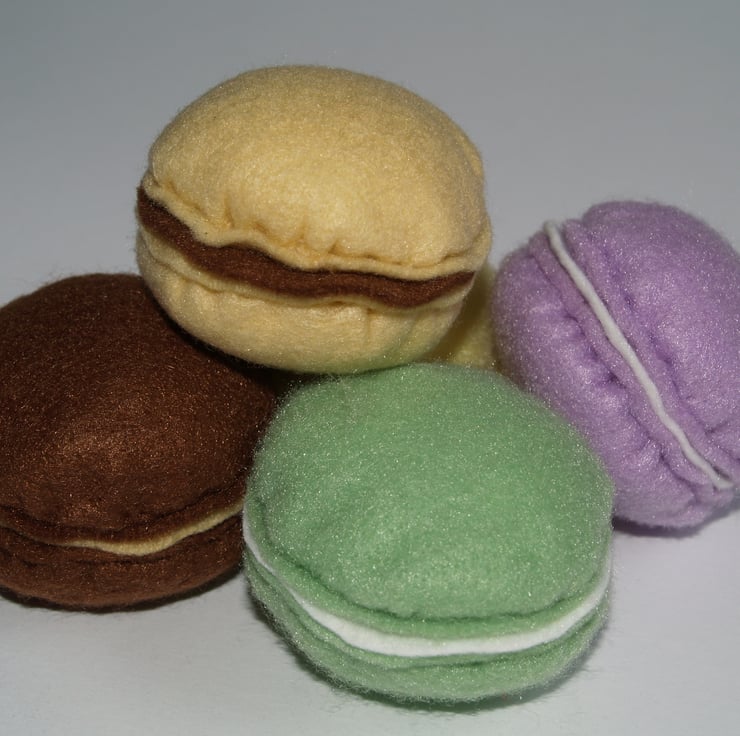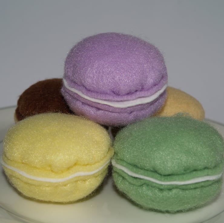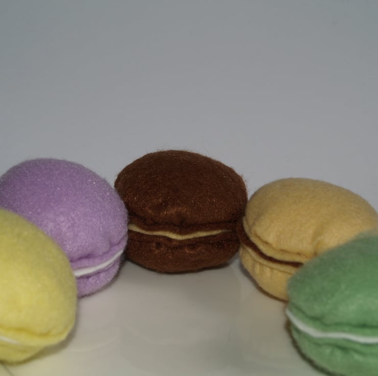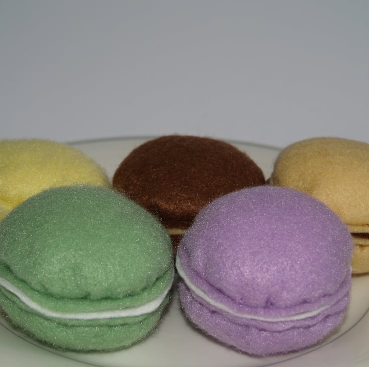 This assortment consists of five macarons - pistachio, violet, lemon, chocolate and vanilla. All the items are made from felt, stuffed with polyester stuffing and are full sized replicas of real macarons. They are not edible, they just look lovely!