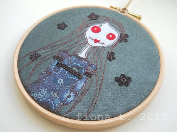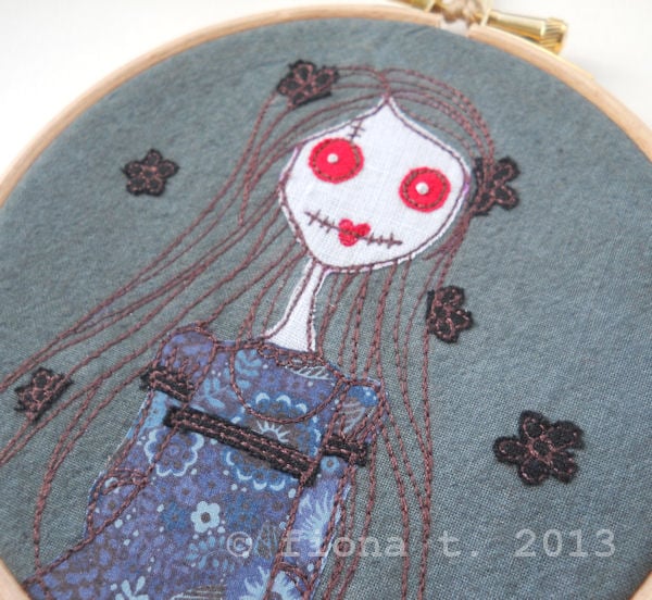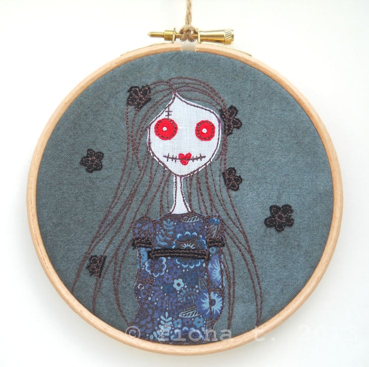 this undead beauty is wearing a pretty blue, navy & black dress in a liberty tana lawn. her blood red eyes contrast with her deathly pale blue linen skin. her eyeballs are hand embroidered.