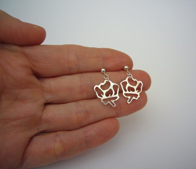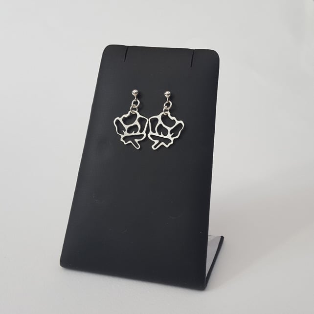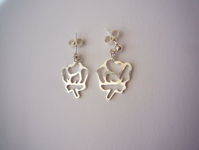 These gorgeous earrings are the last pieces available from a collection of stencil rose jewellery. I created the earrings by hand cutting the flower stencil shape from sterling silver; they have then been attached to sterling silver ear posts.