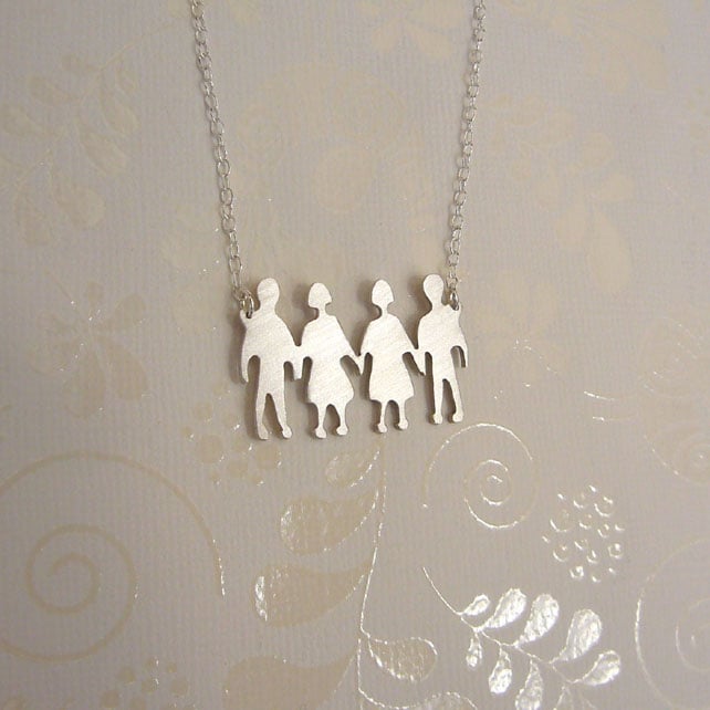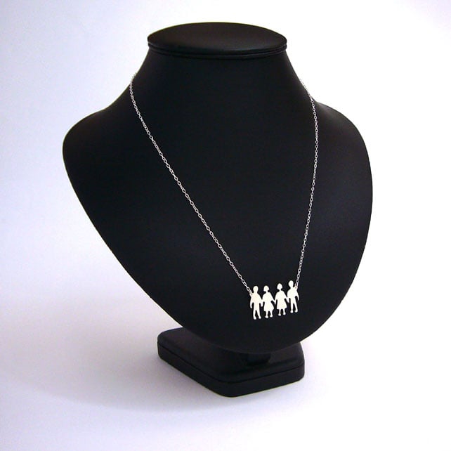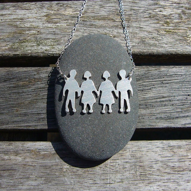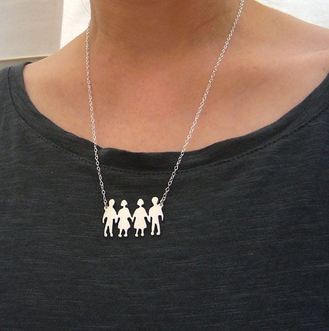 This 4 children necklace would make a unique gift for someone special. I make each necklace to order by hand, by cutting the design from sterling silver and the style is available with different configurations. I designed this necklace after being inspired by both my children and wanting to make a different style of personalised jewellery. If you like the design but would like a slightly different outline (for example the ‘bob’ hairstyle without the dress) please don’t hesitate to contact me.