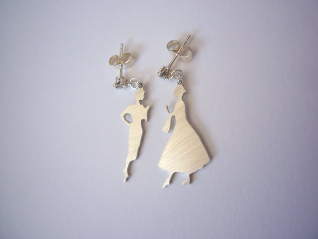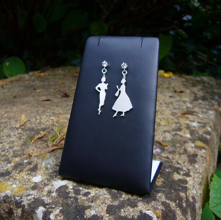 This is a unique design with 2 different ladies, hand cut out of 1mm thick sterling silver and given a brushed finish. They are approximately 2.5cm high and are attached to sterling silver ear studs. In each stud is a 3mm clear crystal.
