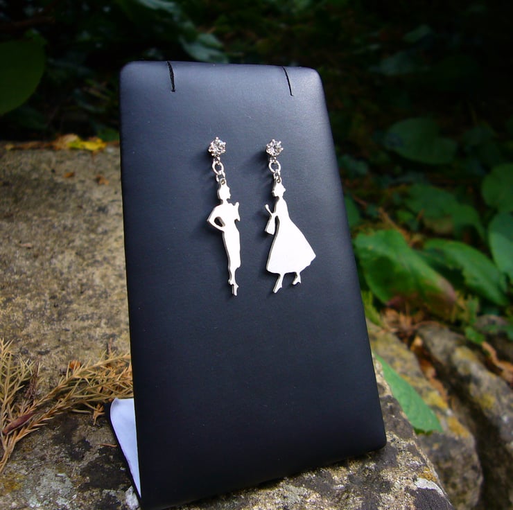This is a unique design with 2 different ladies, hand cut out of 1mm thick sterling silver and given a brushed finish. They are approximately 2.5cm high and are attached to sterling silver ear studs. In each stud is a 3mm clear crystal.