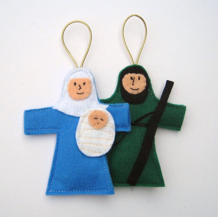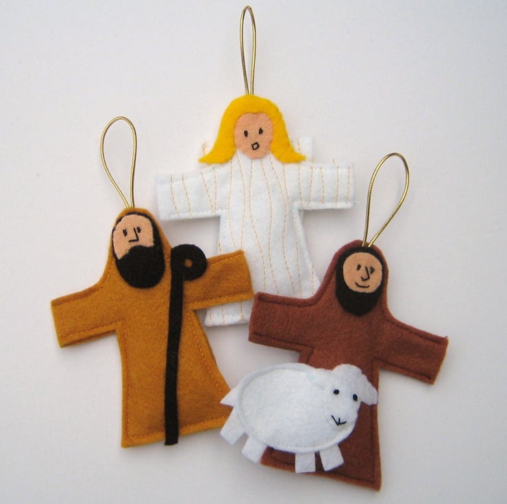 Eight little felt figures (11cm high) from the traditional nativity story to hang on the tree at Christmas time. Lightly padded with polyester wadding and with hand embroidered faces, each character can be easily identified - an angel, 2 shepherds, Mary, Joseph and 3 wise men. A loop of gold braid is securely stitched for hanging.