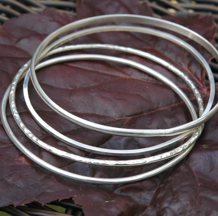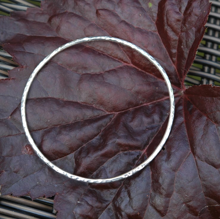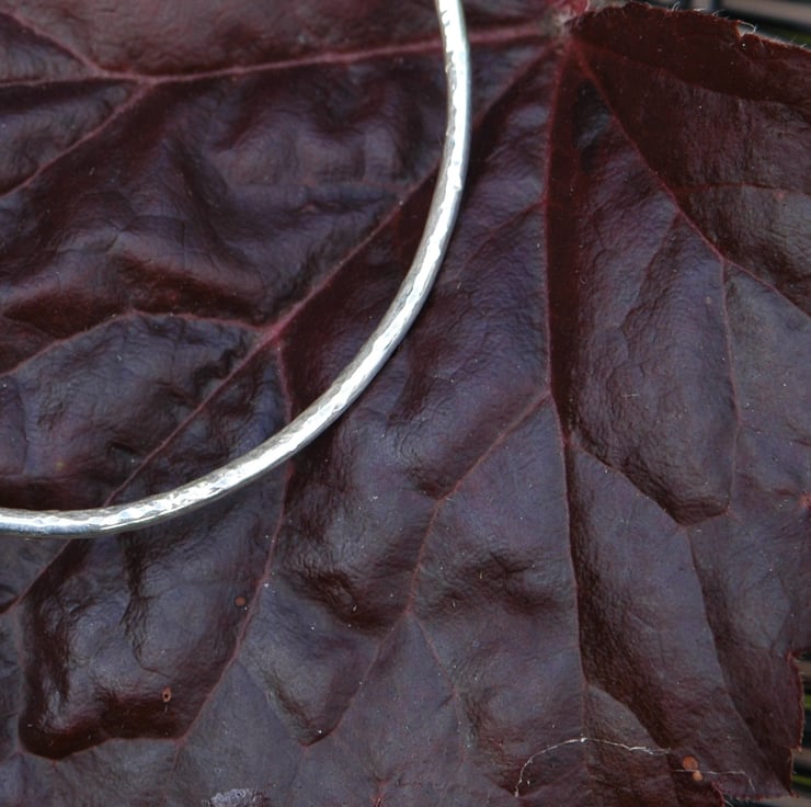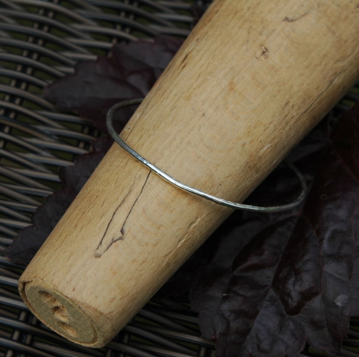 This bangle is a delight to wear either on its own or as part of a stack. It was made from 2mm wide sterling silver round wire. First I formed it into a bracelet shape and soldered it together before texturing the top and bottom surfaces with a ball-peen hammer. It has been polished to a high shine and the hammered finish creates a multi-faceted surface which reflects the light brilliantly.
