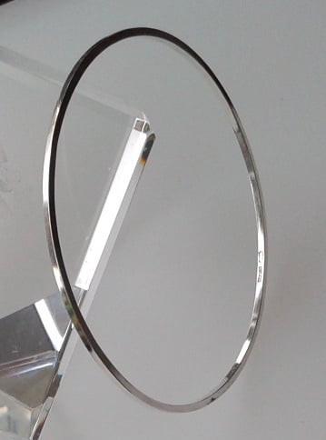 This plain and simple sterling silver bangle is made from 1.5mm wide square wire which has been polished to a high shine. It is light and lovely to wear on its own or with others as a stacking bangle. This item has been hallmarked by the London Assay Office.