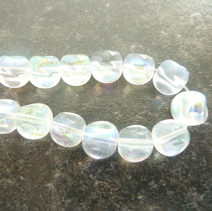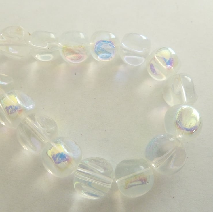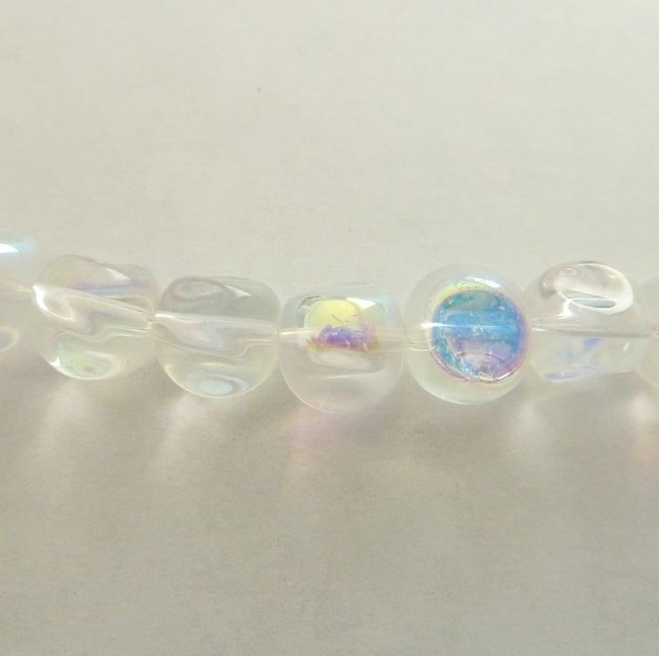 A pack of 20 clear nugget beads, they are AB coated so they shimmer in the light.