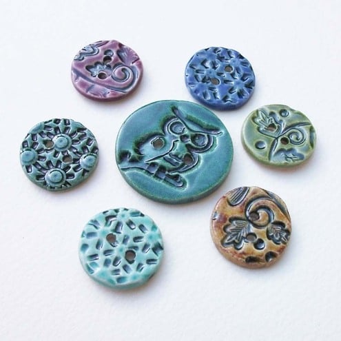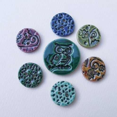 The small buttons are a variety of patterns and colours and the larger button is an owl in a shiny forest green glaze.