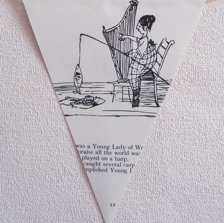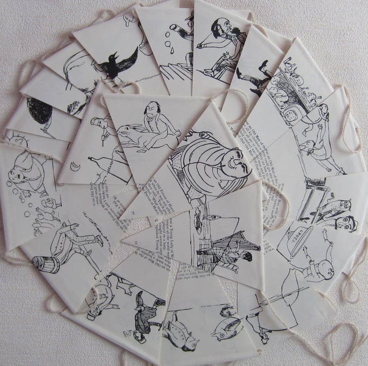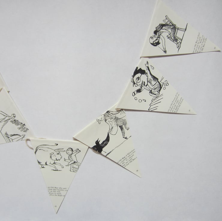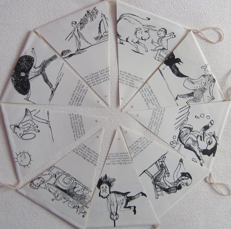 Paper bunting up-cycled from the pages of Edward Lear's Nonsense Limericks book. 21 flags each measuring 11 cms wide and 13.5 cms long. 11 cms in between each flag and the whole string measures nearly 5 metres long. Comical designs on both back and front.