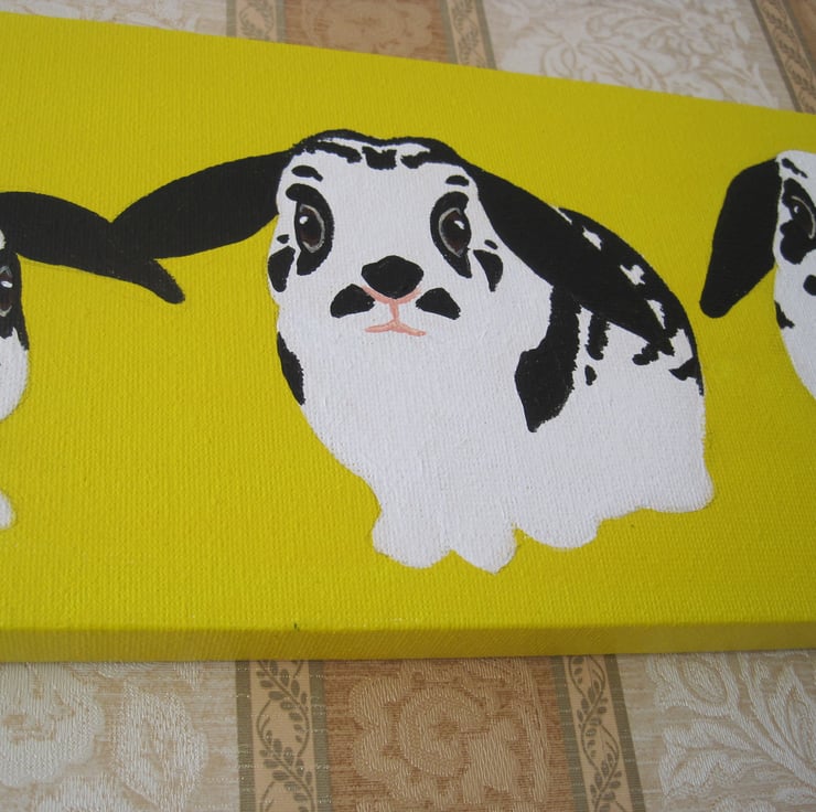 An original acrylic painting of 3 bunnies. Each rabbit is the same colour / markings, based on black and white lops with butterfly markings.