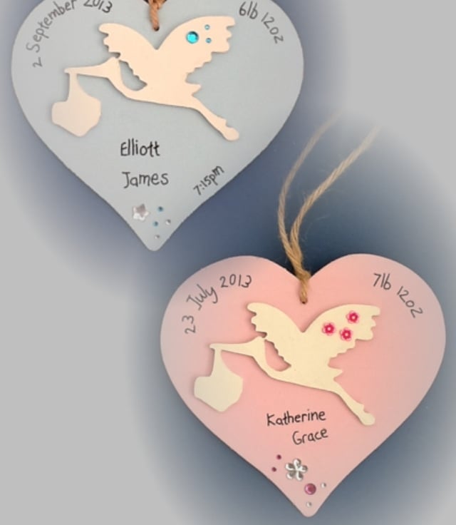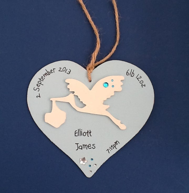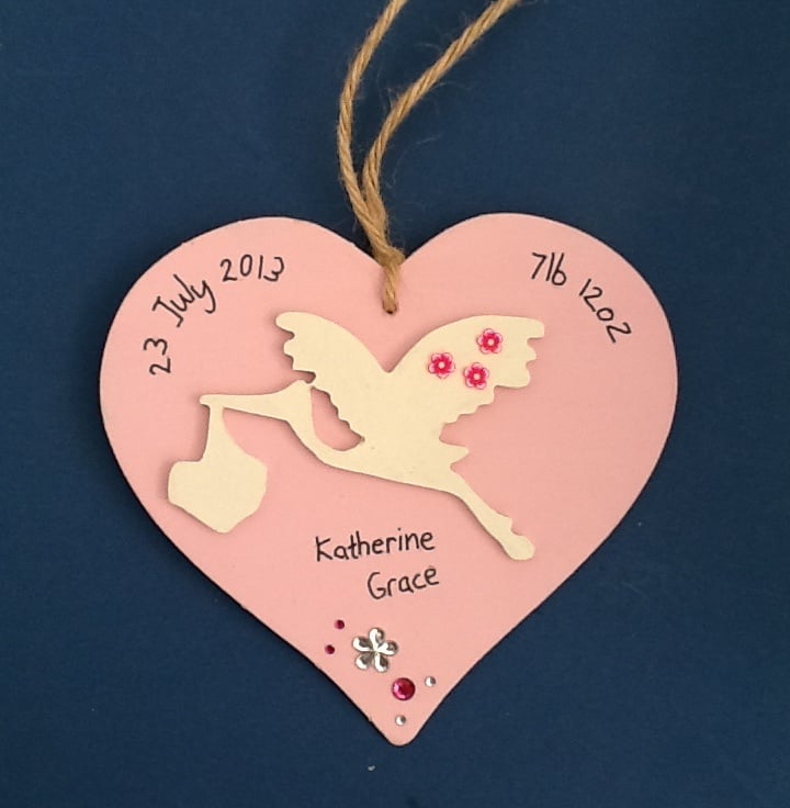 A painted wooden stork mounted on a 12cm (approx) painted wooden heart and embellished with fimo flowers (optional) and acrylic gems. The heart is then personalised with details of baby, name, date and time of birth, weight and any other as requested.