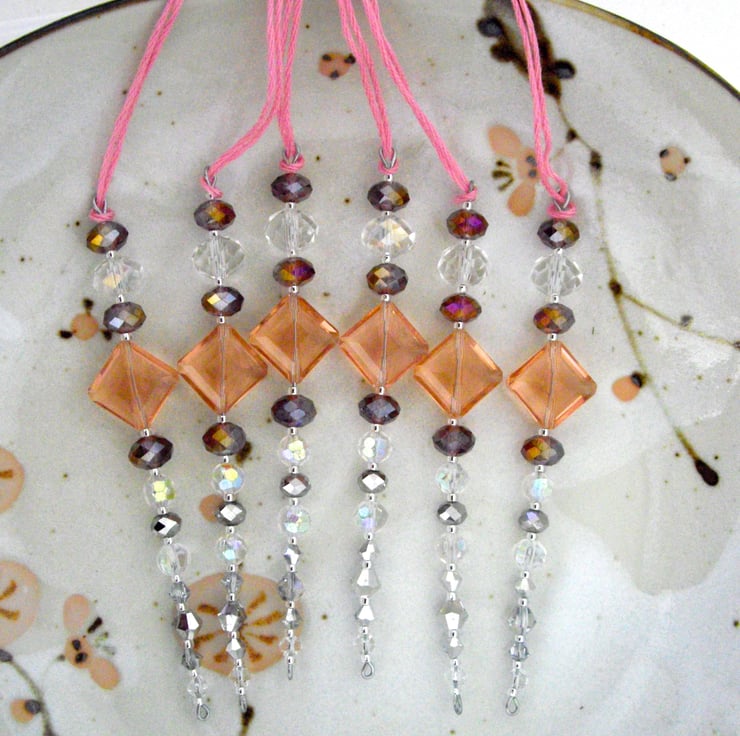 Each is made from a selection of complimentary crystal pink (dark and pale), silver and clear beads, including AB finished beads for extra shine. They really catch the light.