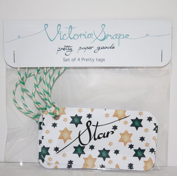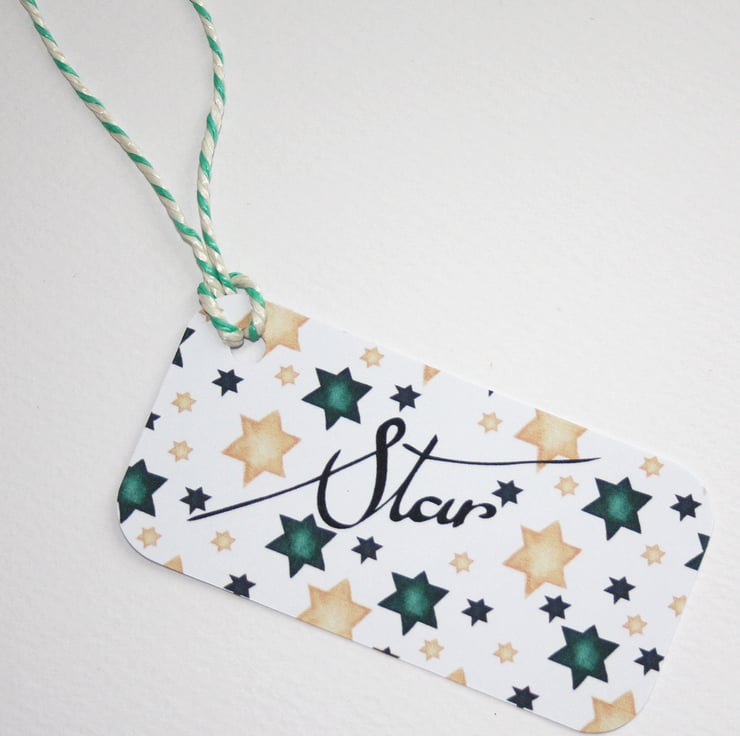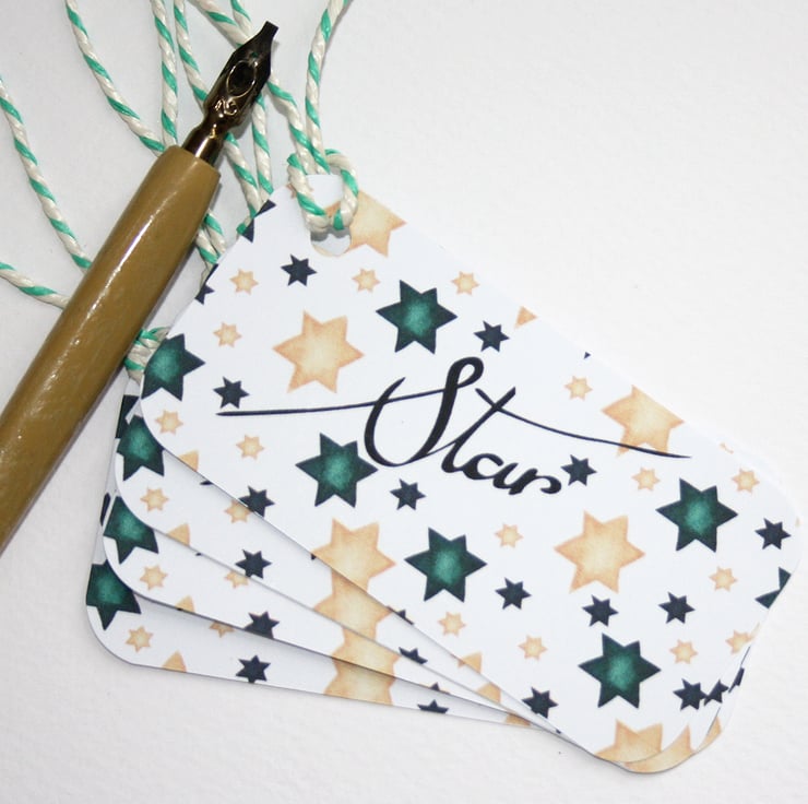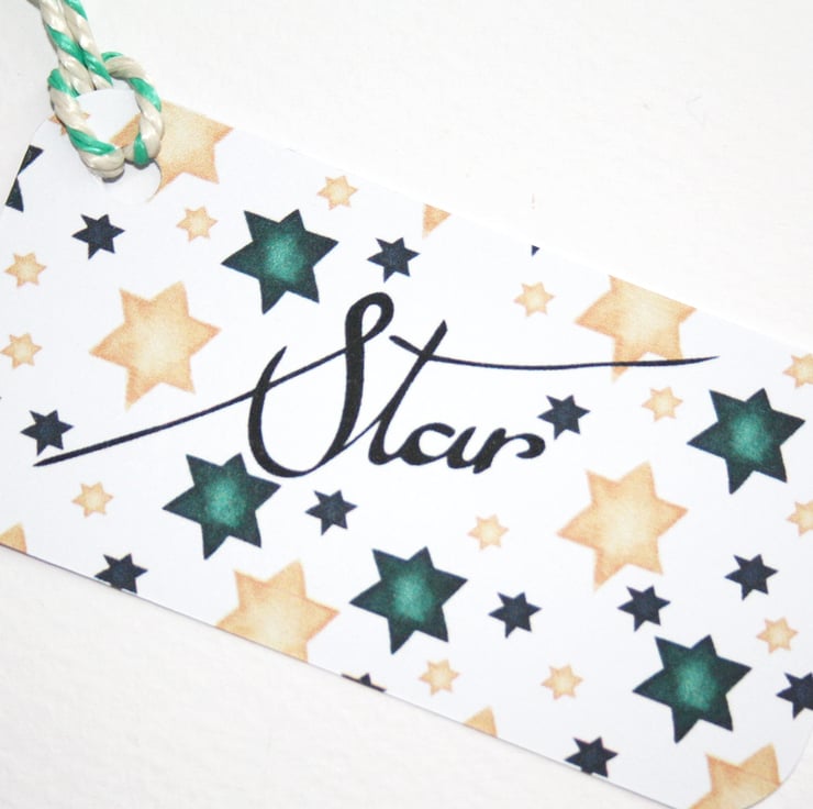 Set of four gift tags with pretty patterned watercolour stars with a calligraphy 'star'.