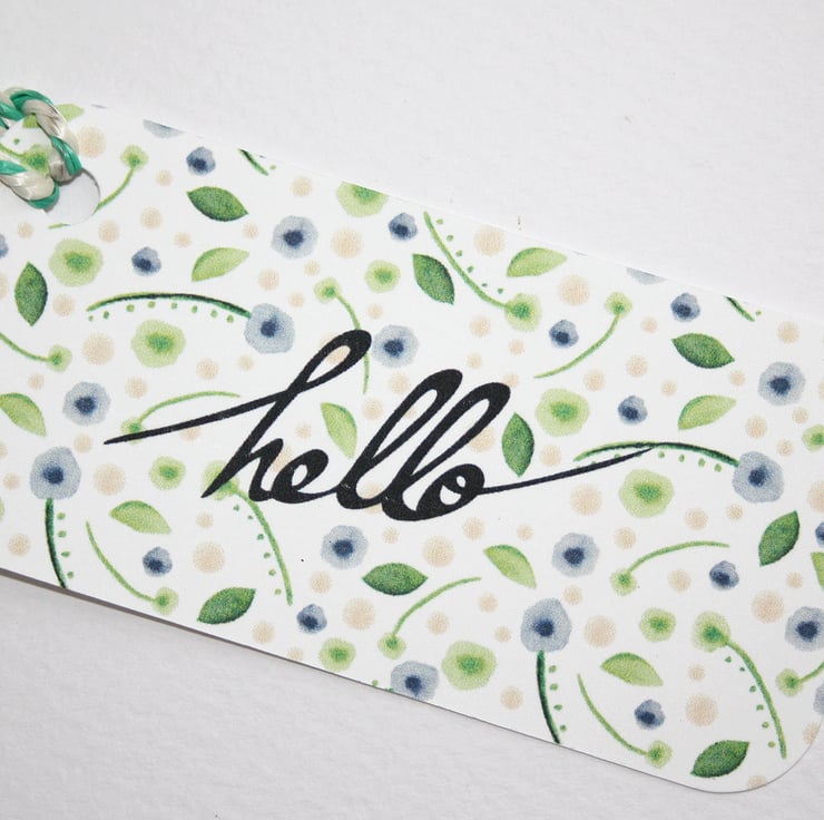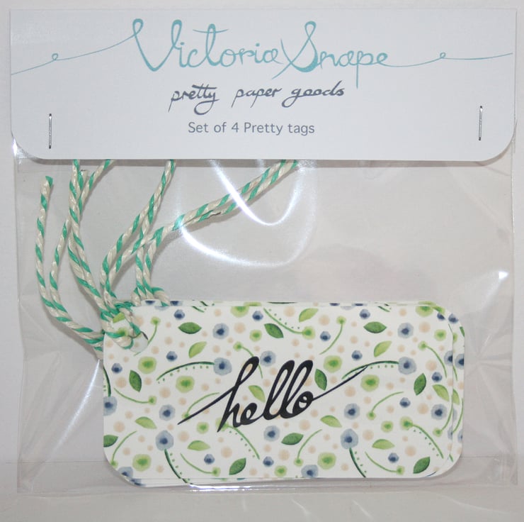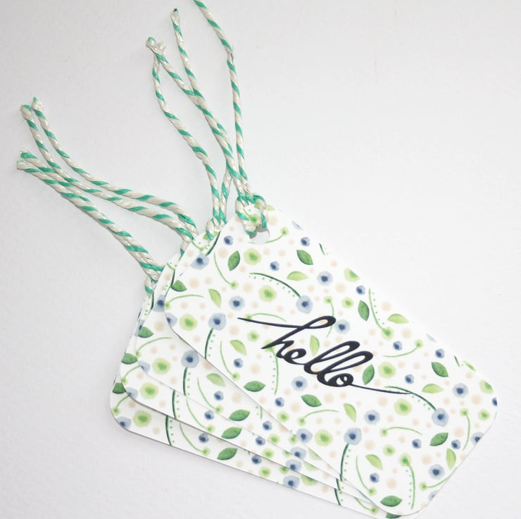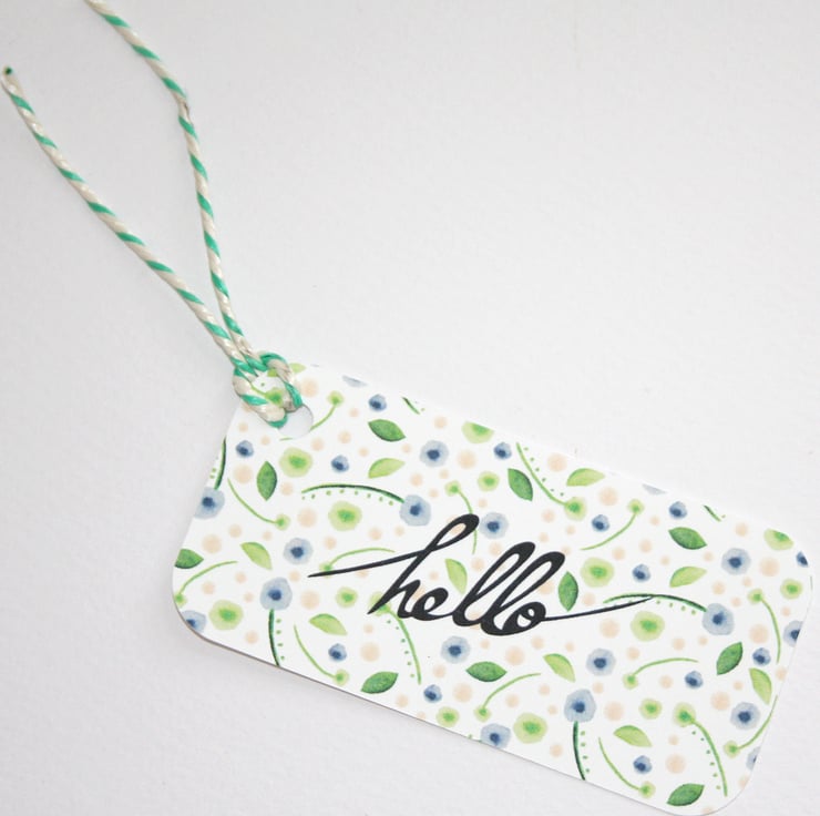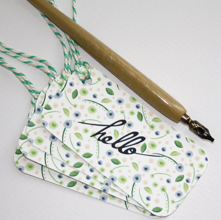 Set of four gift tags, pretty watercolour floral ditzy pattern with a calligraphy 'hello'.