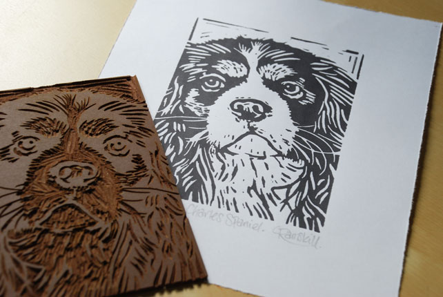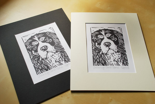 'Cavalier King Charles Spaniel Dog' - Original, hand printed linocut, printed on hand press, available in black or rich tan ink. Signed and titled in pencil by the artist.