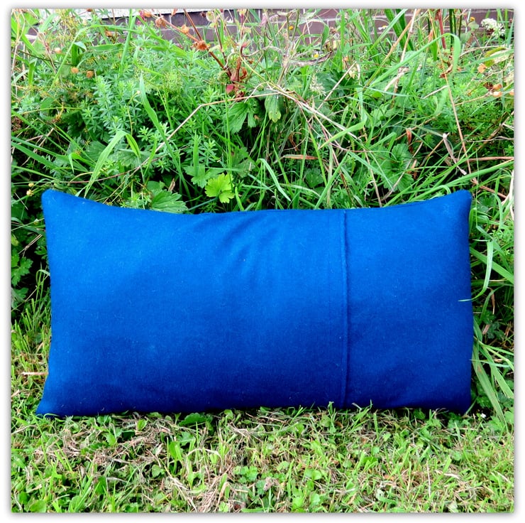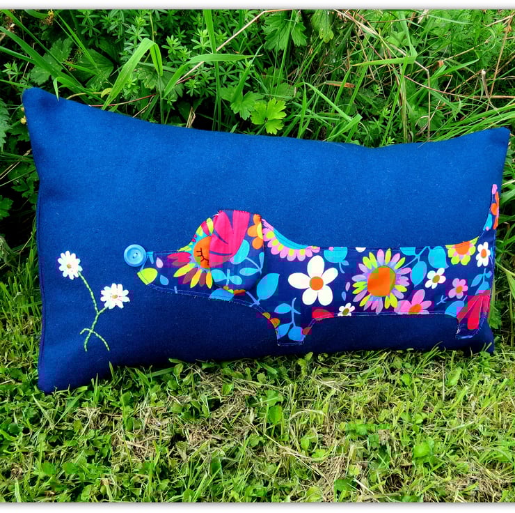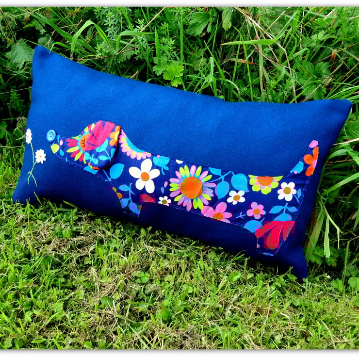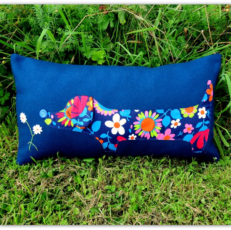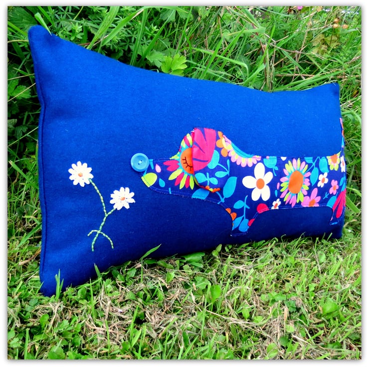 The dachshund has been hand appliqued with an original 1960's flower power fabric, on to a royal blue wool.