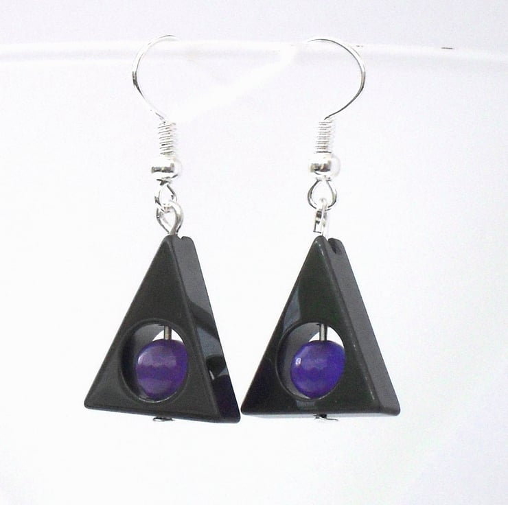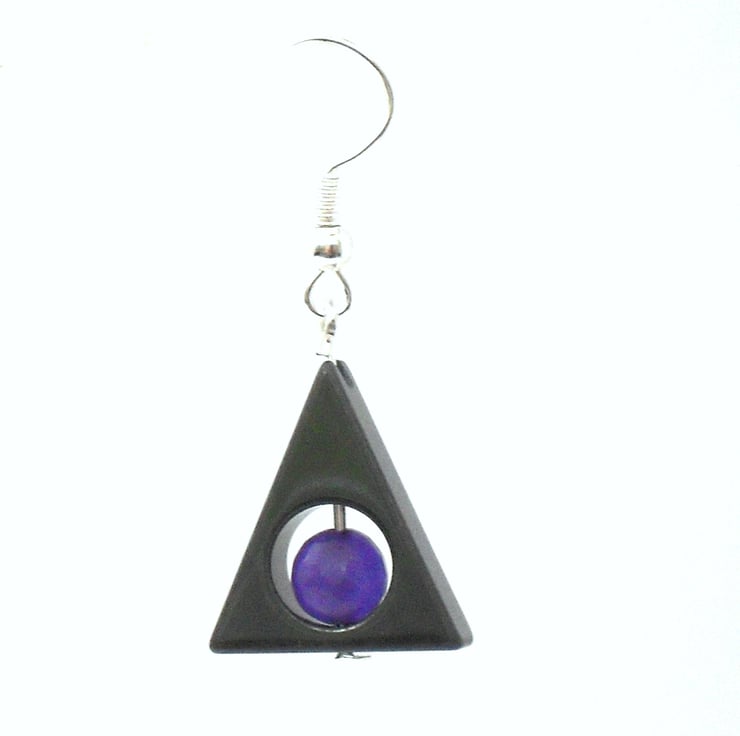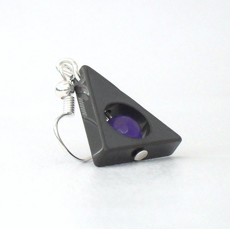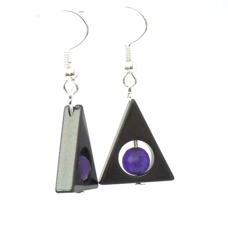 I enjoy creating unusual jewellery, and the triangular hematite coupled with the purple alexandrite provides great ingredients for making these striking earrings.