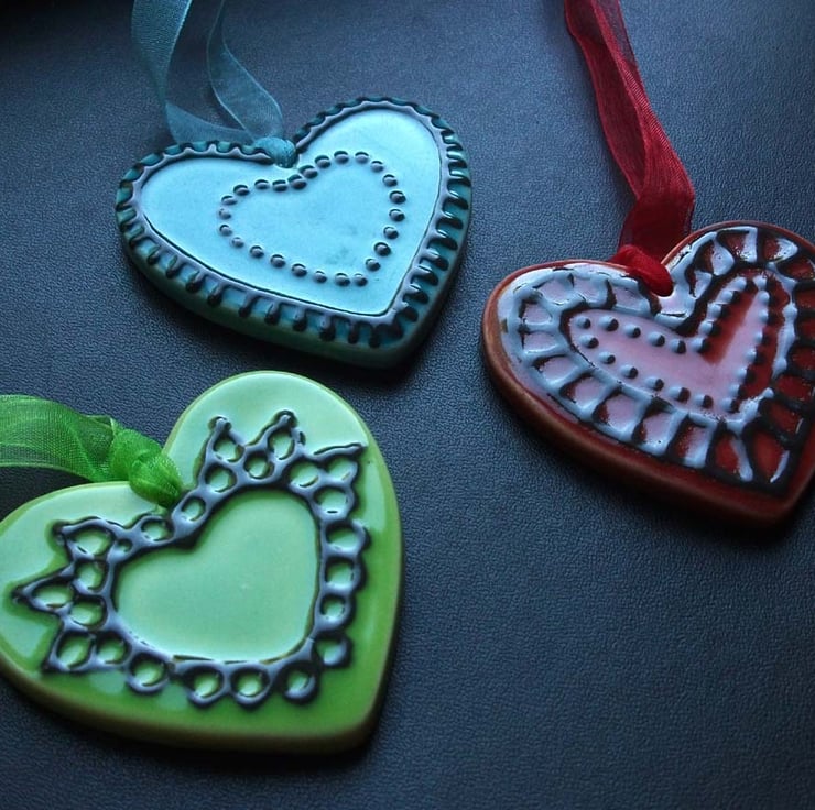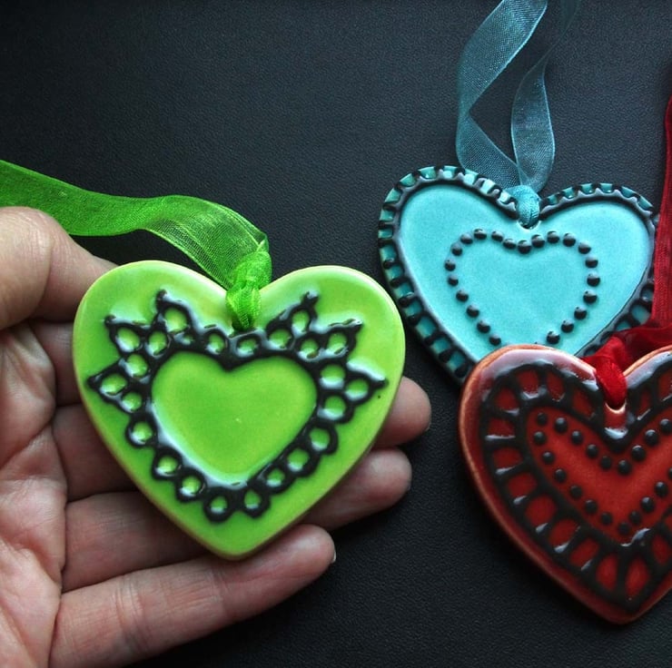 This set of three brightly coloured ceramic hearts are made from white earthenware clay.
