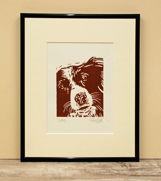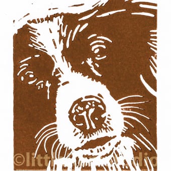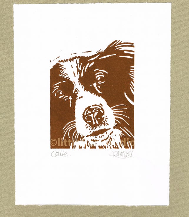 'Brown Collie Dog' - Original, hand pulled Linocut Print, printed on hand press in brown ink. Signed and titled in pencil by the artist.