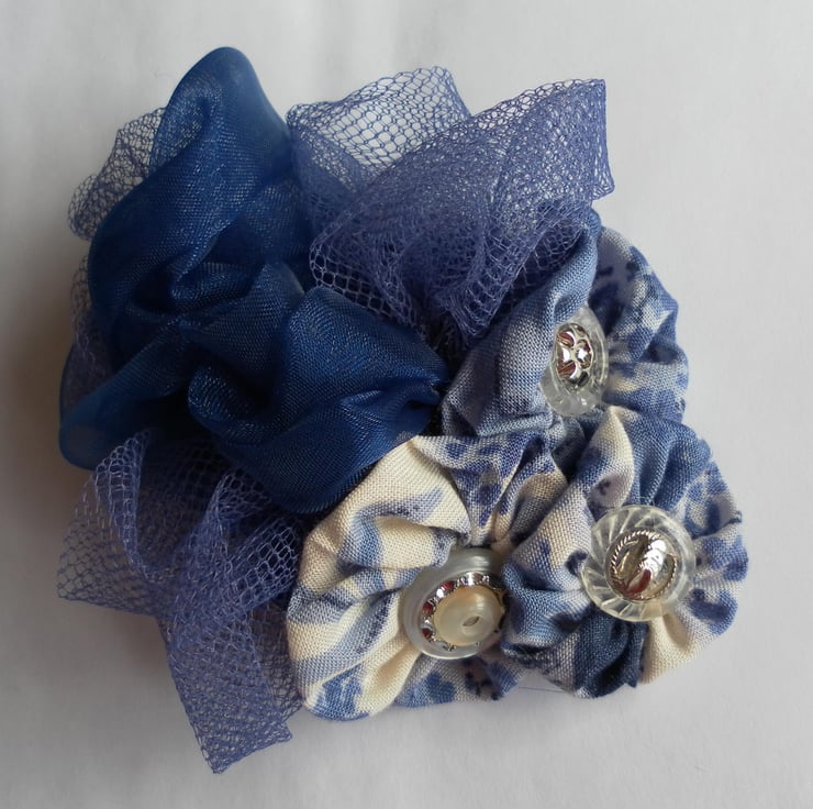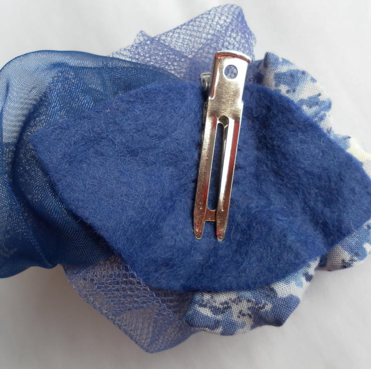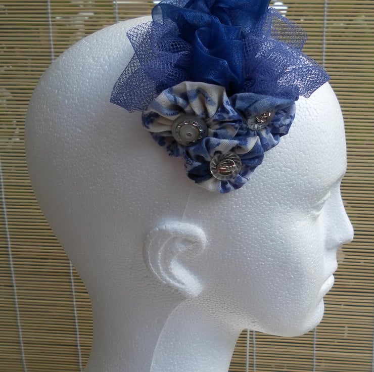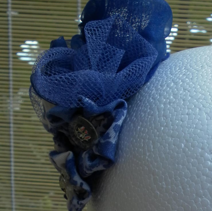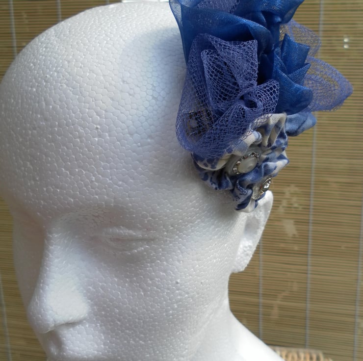 This stunning hair accessory is hand made by me and would be exclusive to you. The roses are made from blue organza and blue net and nestle above three blue and white flowers with button centres. They are attached to a blue felt base with a hair clip. It measures approximately 9cm x 10cm.
