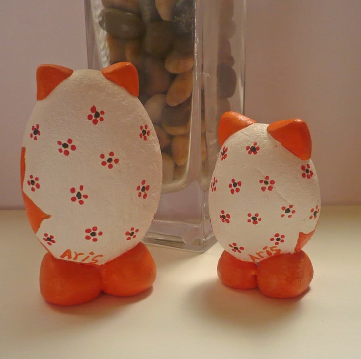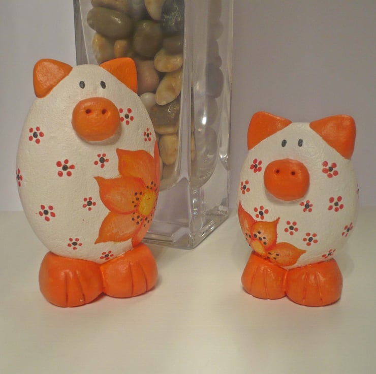 A lovely pair of hand painted Pebble Pigs. The ears, snout and feet have been formed using clay and then firmly adhered to the pebble, the decorative paint work has been varnished for protection and the pebble has been signed by myself on the back.