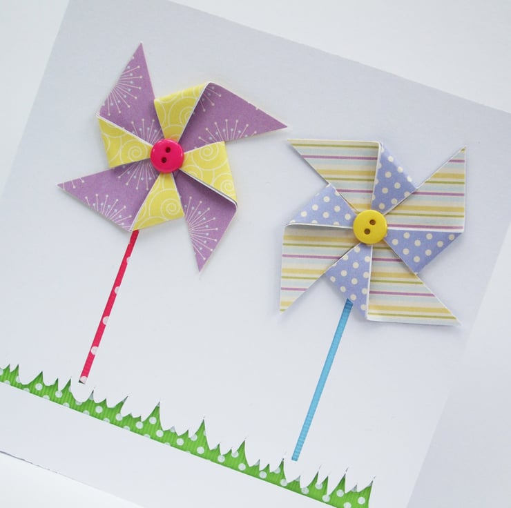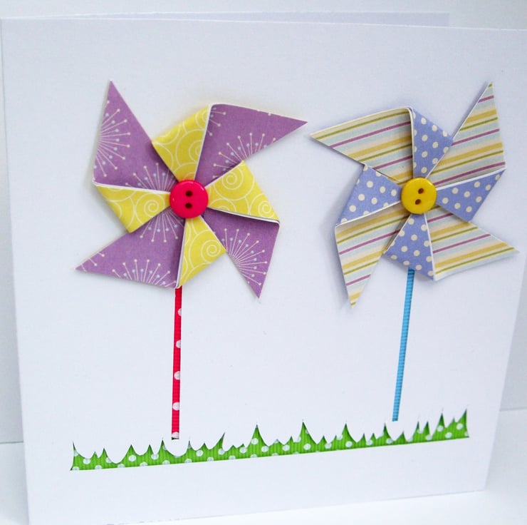 These cute little windmills have been made with brightly coloured paper with a little button in the middle. The grass and windmill sticks have been hand cut out of the card and coloured ribbon has been stuck behind, making a fun and cheerful card for any occasion.