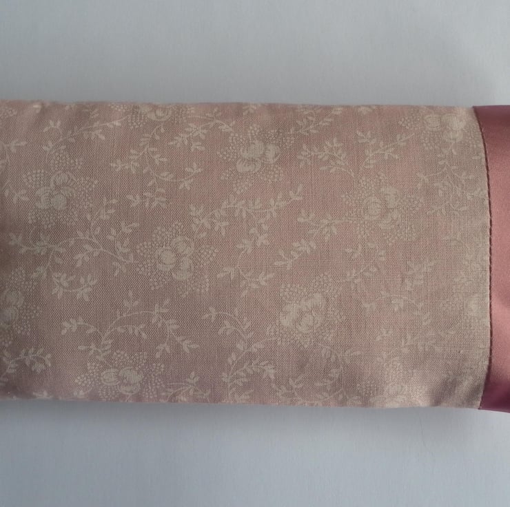 The pretty and feminine, envelope glasses case is made from a pink, floral cotton fabric and edged in a dusty pink satin. It is lined with dark pink cotton and lightly padded. The case has two button and handmade loop closures and measures17cm x 9cm. The zipped make up bag is made from the same pink floral cotton fabric, trimmed with a dusty pink satin ribbon and bow and a matching satin ribbon on the zip pull. It is lined with a dusty pink cotton fabric and measures17cm x 12cm.