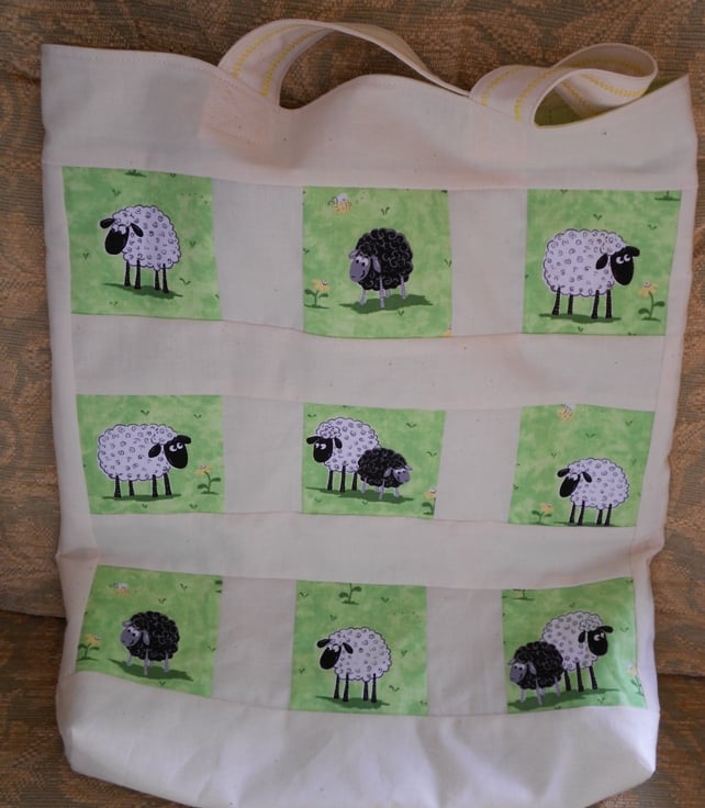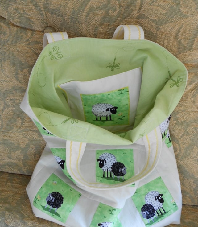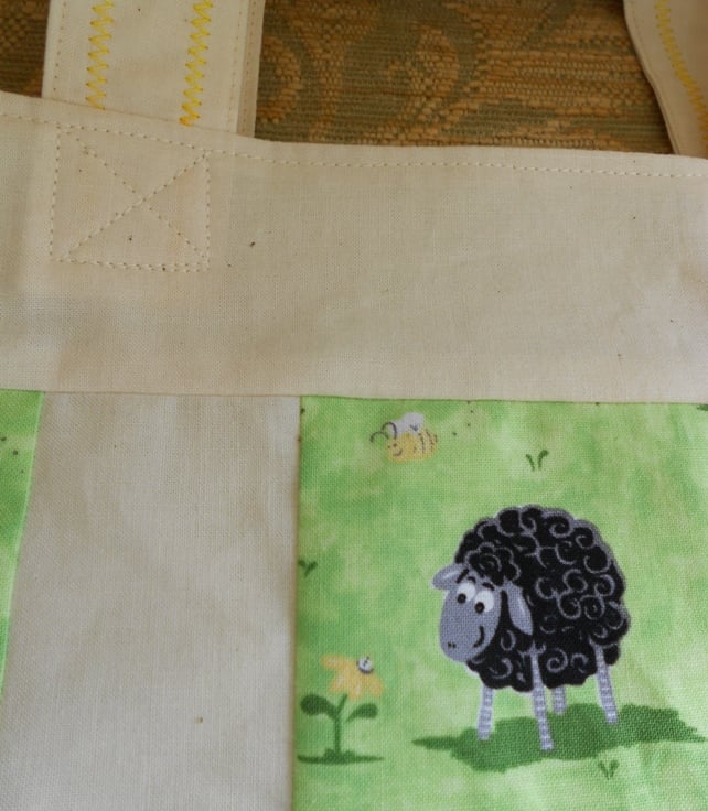 I've made this bag from very good quality, 100% cotton materials. It is fully lined with a pocket decorated with another of those cheeky sheep. The 12 inch handles are top-stitched and have been sewn securely into the bag to make sure it is strong enough to take a generous load of shopping (or maybe knitting?). The bag measures approx 12 inches across, 14 inches long and 2 inches deep.