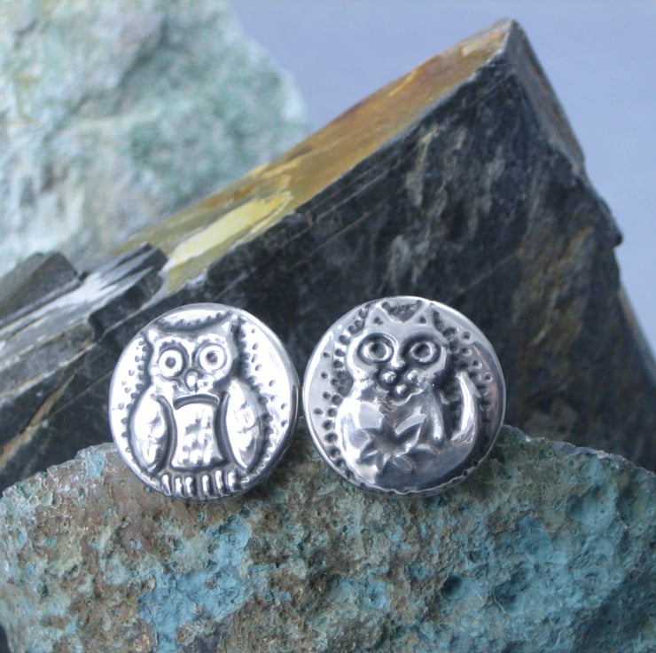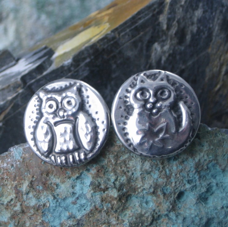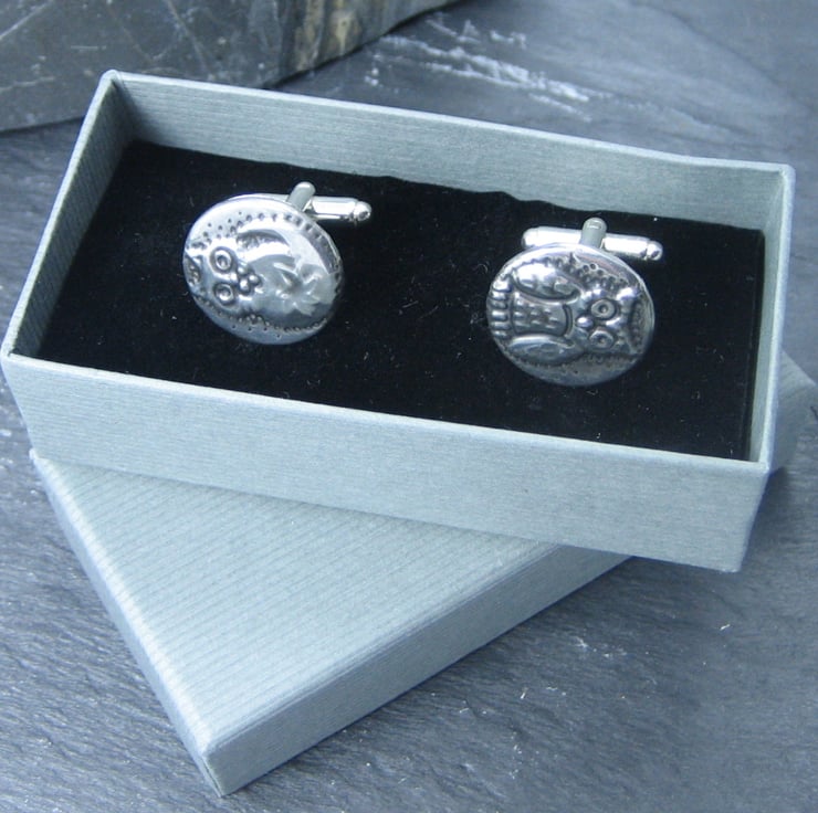 The Owl and the Pussycat went to sea...... These cufflinks have been individually hand-crafted in shiny modern pewter, and feature the romantic pair from Edward Lear's rhyme. Each link measures 2cm,(0.75ins),across. They are presented in a smart grey gift box. A great gift for a man for a 10th Wedding Anniversary, Fathers' Day, Valentine's Day, Birthday or Christmas.