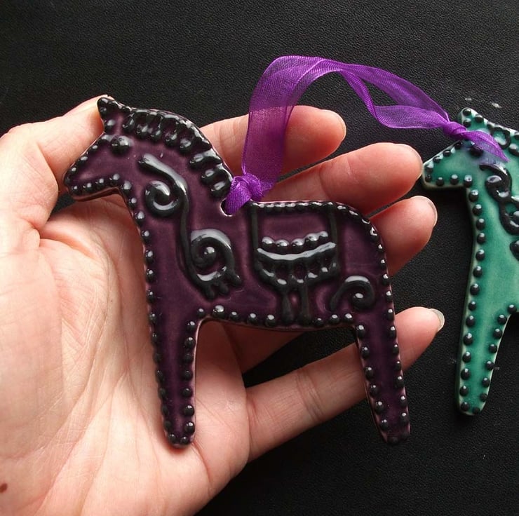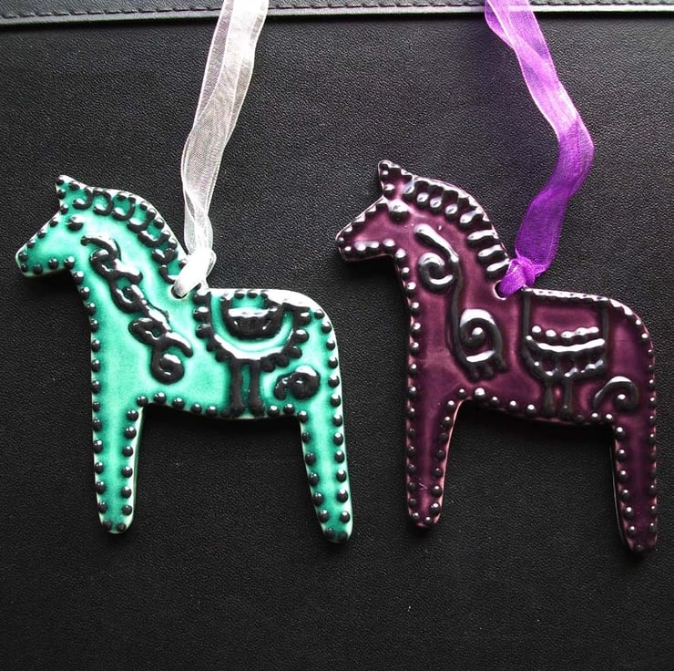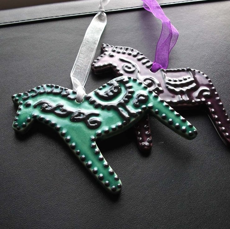 These cute little horses are cut from white earthenware clay and decorated in a folk art style.