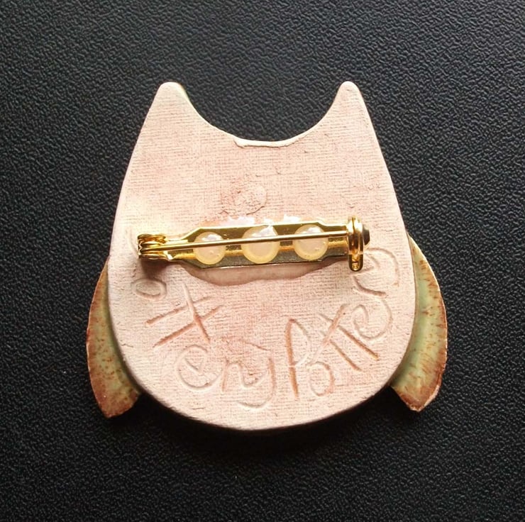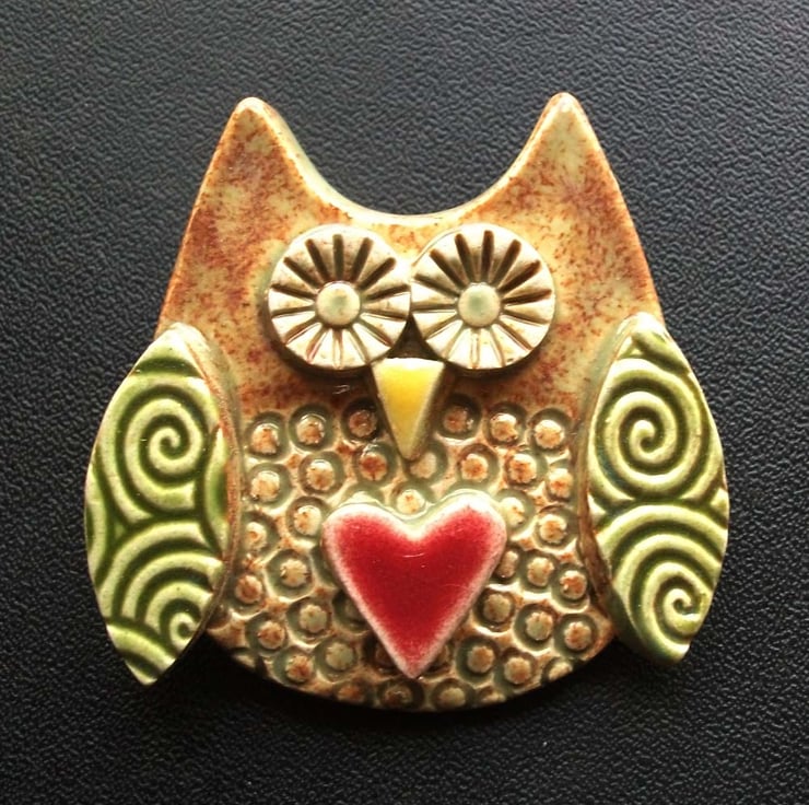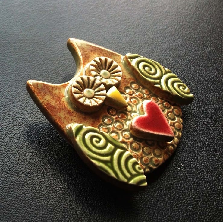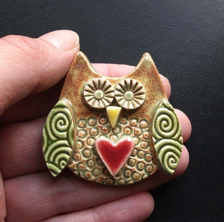 Cute little ceramic owl brooch green wings